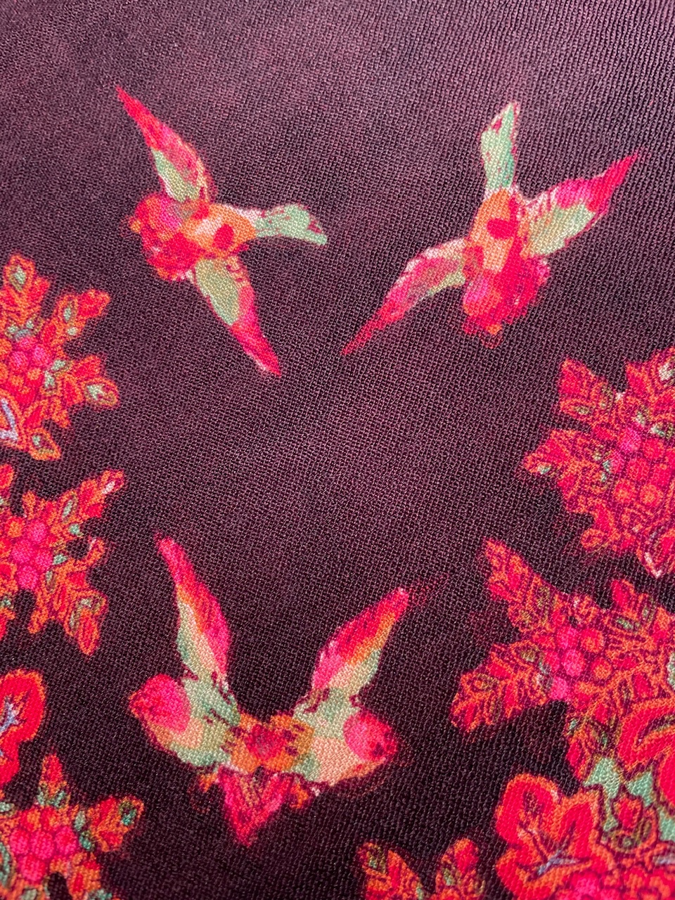 Цветовое решение очень насыщенное. Рисунок выполнен в красных, оранжевых, розовых, желтых, сиреневых и светло-зелёных цветах.