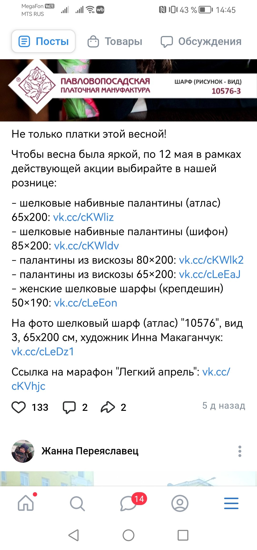 Valentinovna писал(а): ↑09 май 2025, 23:15На шелковые шали особенно хороша цена в мазинах дисконт. В остатках стандартного сорта 4250 руб.