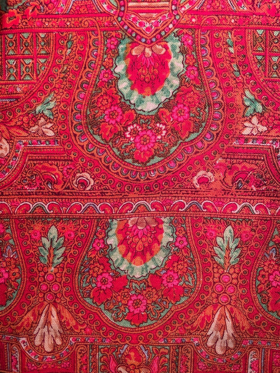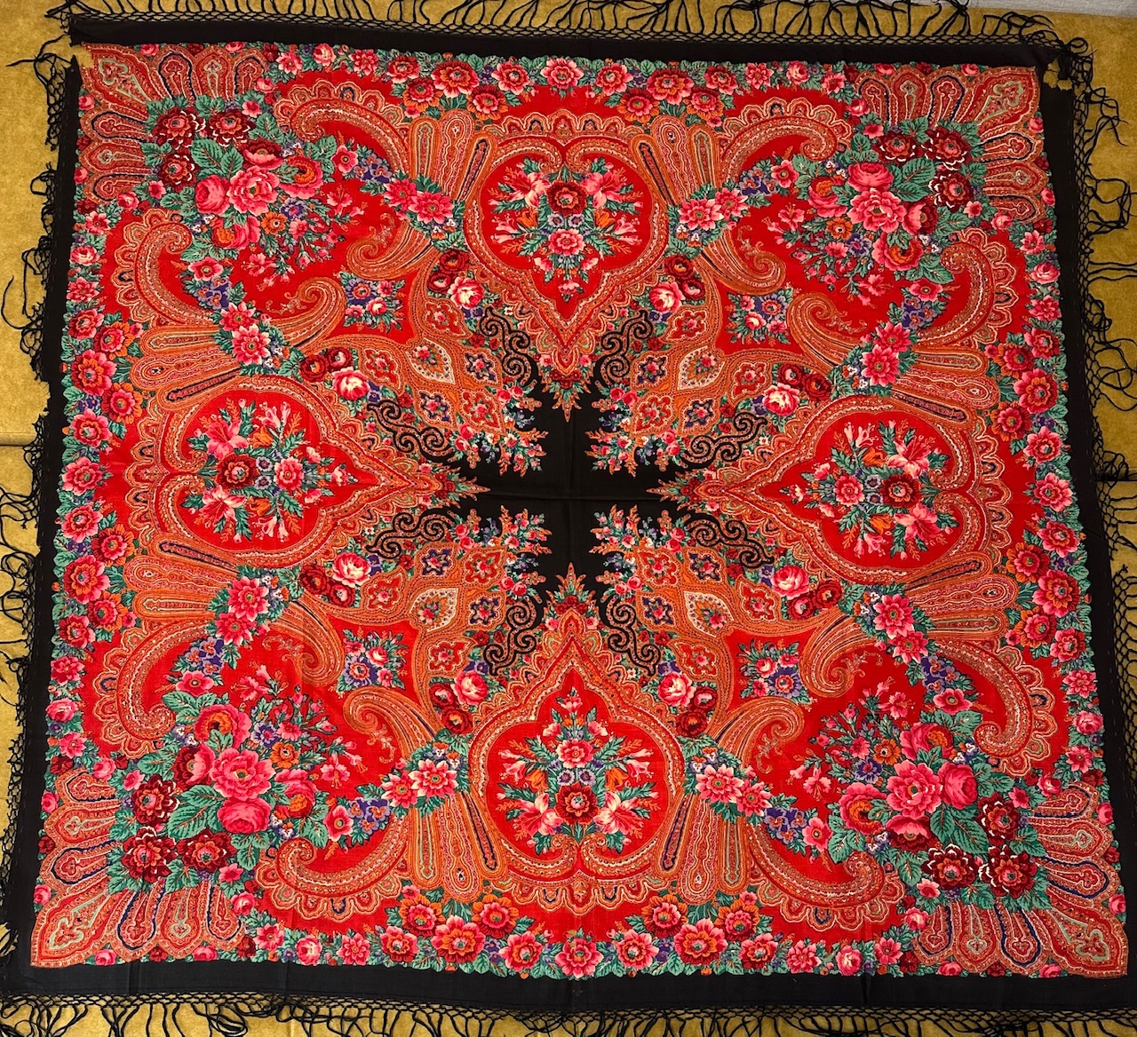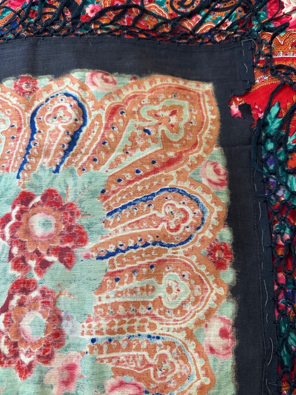 Старинная орнаментальная шаль конца XIX — начала ХХ в, тонкая шерсть саржевого плетения, ручная набойка, 160х166. Кистей нет. Следов от них нет. Клеймо отсутствует.