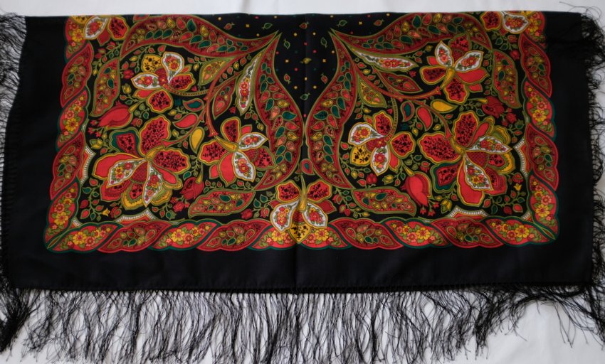 Новенький! Пахнет краской - обожаю! Шерсть отличная, пластичная, не колючая. Как хорошо, что я, мечтая об этом платке, не стала искать старый вариант для покупки с рук. Бахрому наверное сниму.