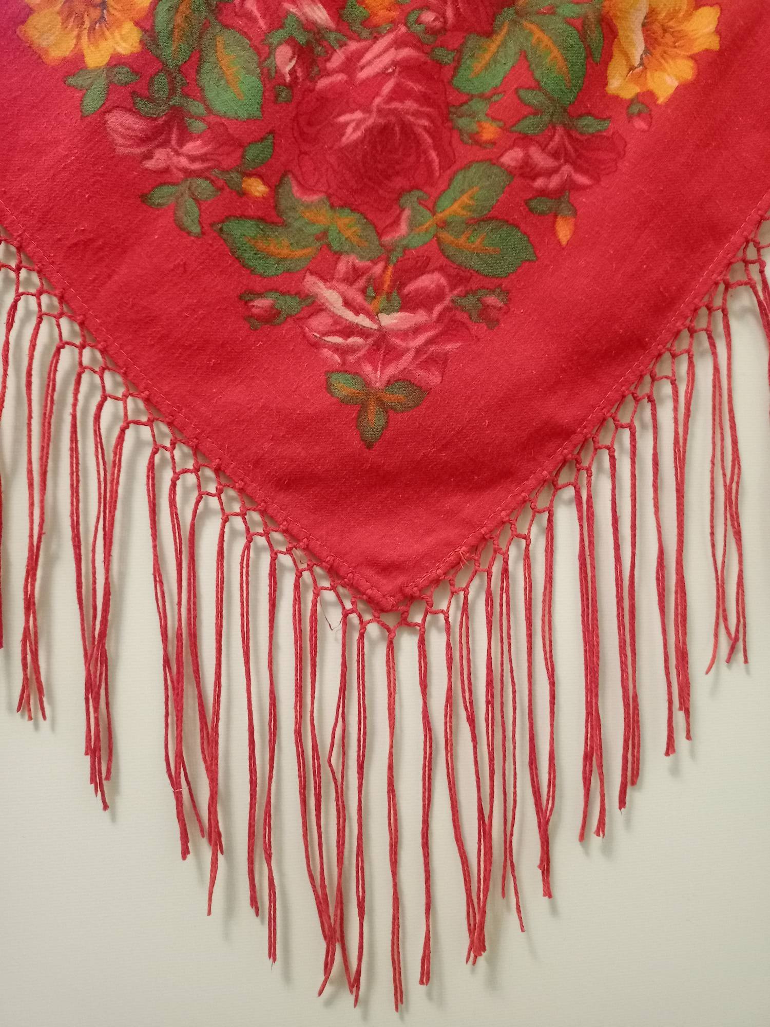 Хлопковый платок, если точно, то 91 на 92 см, с бахромой, колорит не совпадает ни с одним из представленных на данный момент на форуме шерстяных вариантов. Поле красное, цветы красные и жёлто-оранжевые. Синие и т.п. краски отсутствуют.