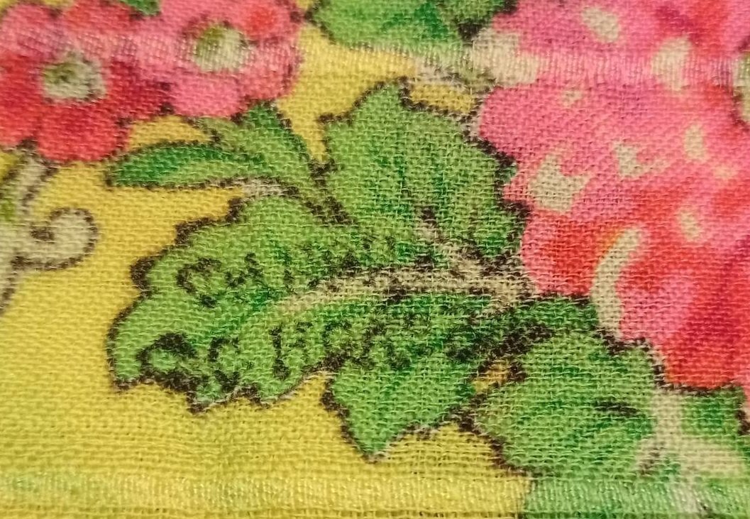 Хлопковая смесовая шаль, размер после стирок 140 см. Имела раньше вискозную бахрому. Гвоздики и ещё какие-то жёлтые цветочки.