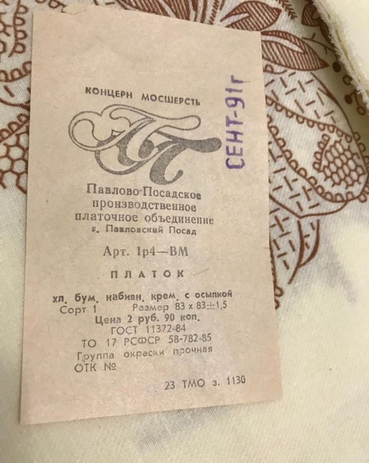 Но по этикетке мы видим, что здесь платок не шерстяной, а хлопковый и гораздо более ранний. Этикетка несколько непривычная по внешнему виду.