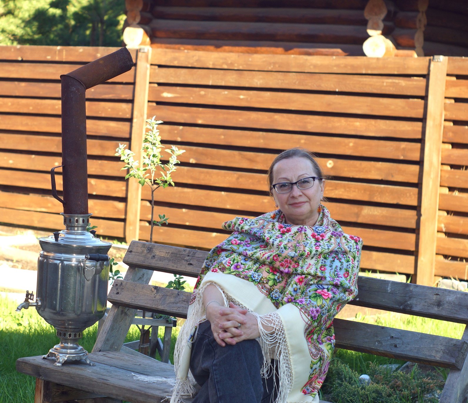 Юля, шаль на Вас как родная. Красиво смотритесь вдвоём на фоне чудесных деревяных (это Ваша дача?) построек.