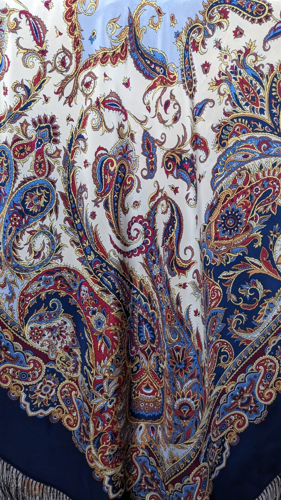 Шаль без бахромы старее, видно , что белый шелк тоже желтеет как шерсть со временем, не сильно