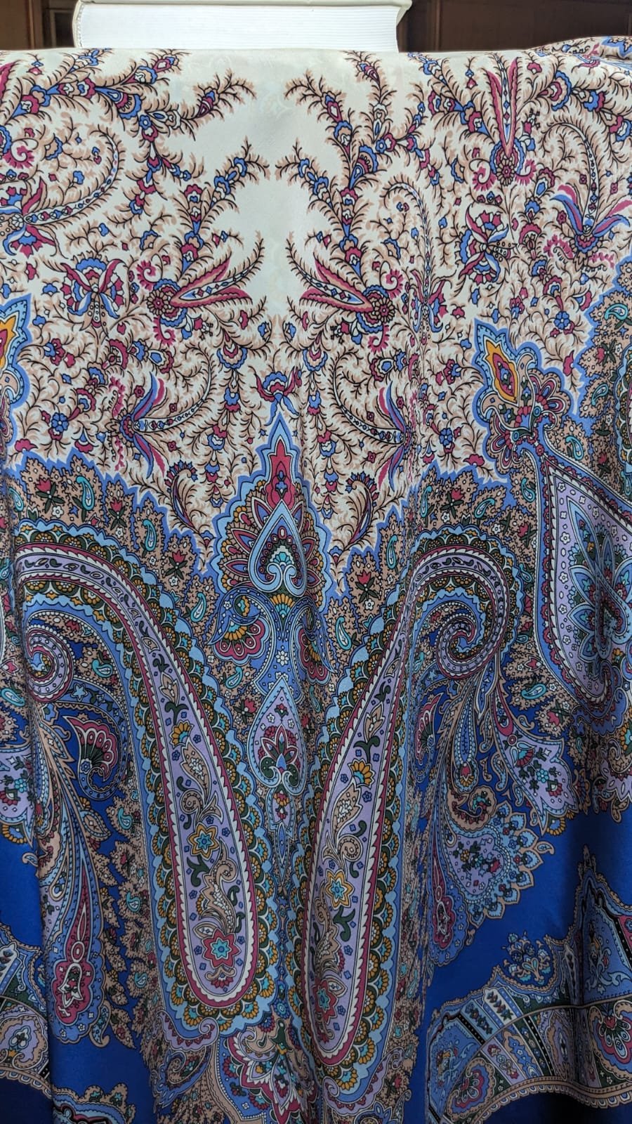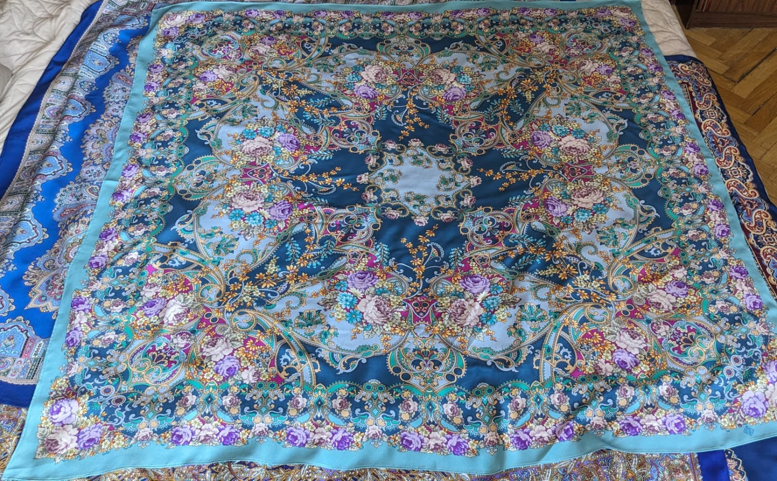 Восточные сладости с синей каймой и светлой серединой...шик! Задумалась о ней .Редко ношу большой шёлк, но такую шаль хочется иметь как драгоценность!