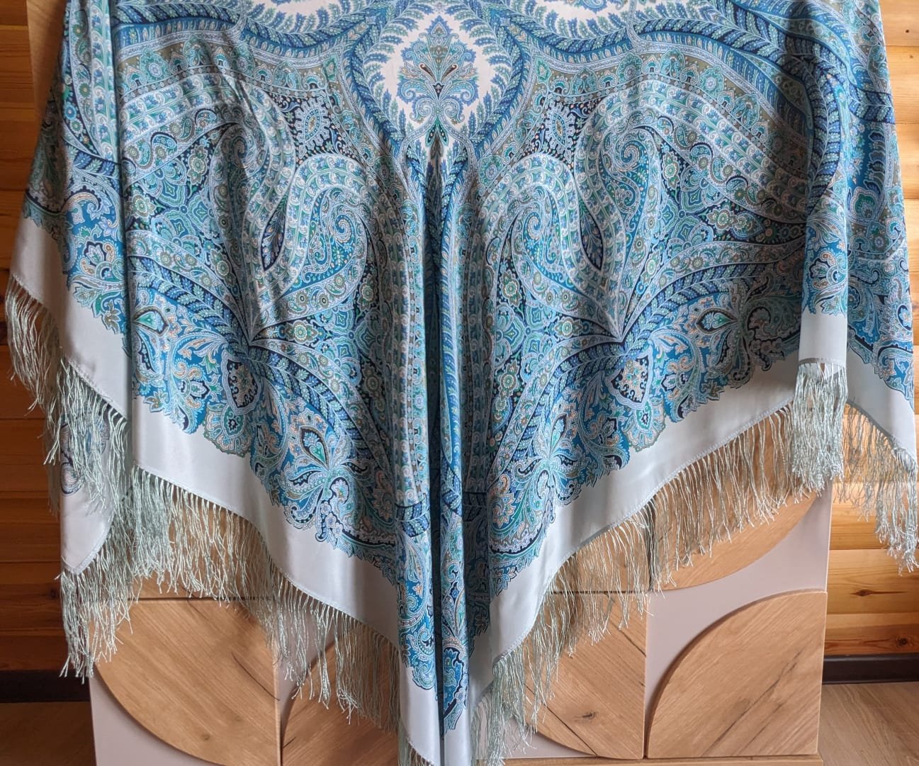 Было у меня с ней и потрясение. Как много раз не рассматривала картинки, не видела там зелёного цвета. А он там на четверть заполняет пространство, теперь уже я его вижу на тех фото, которые рассматривала. Обман зрения у меня был. Шаль очень красивая, влюбилась в нее. И зелёный флёр делает ее не похожей на другие голубые