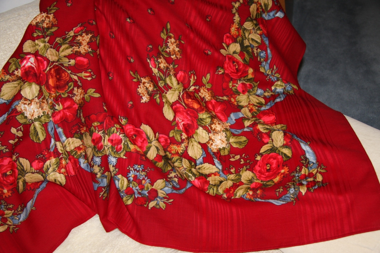 Как и обещала, показываю красные Свадебные ленты, старинный платок, восстановленный Татьяной Сухаревской. Милейший рисунок, нежнейшие розы на ярко-малиновом, рассматривать и рассматривать...