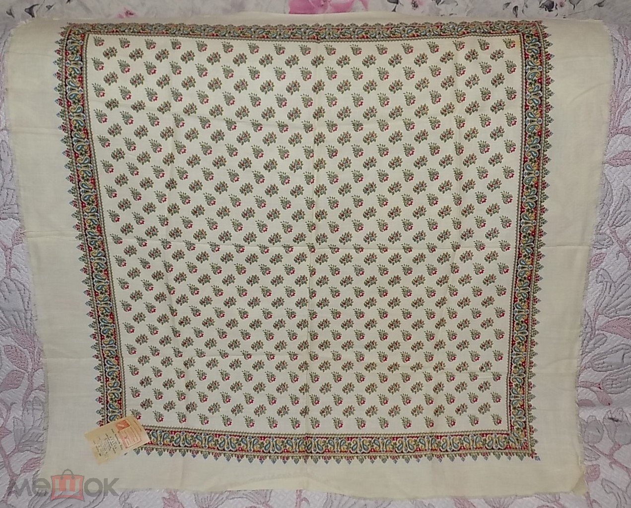 Старинный мериносовый платок розовый набивной