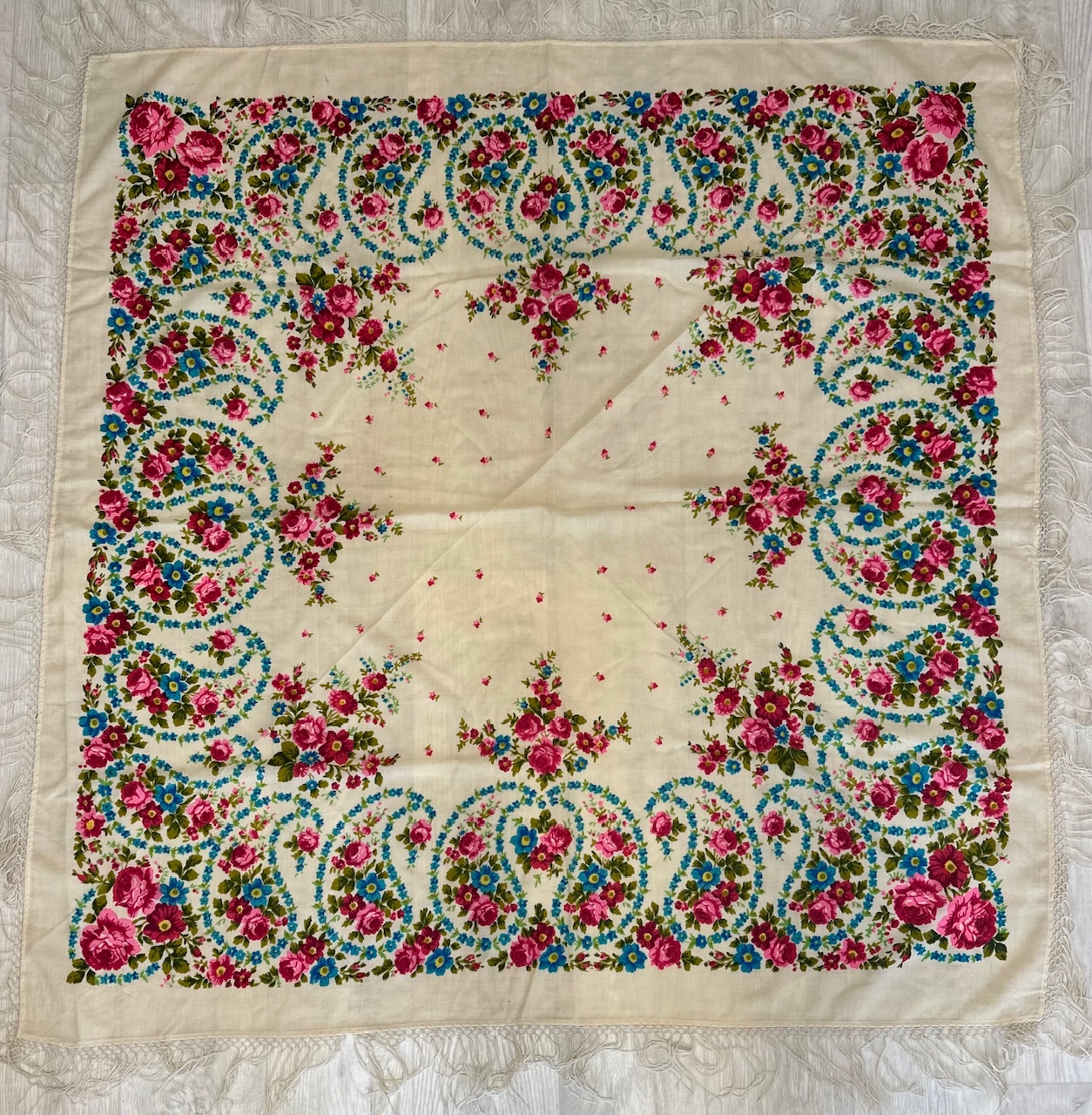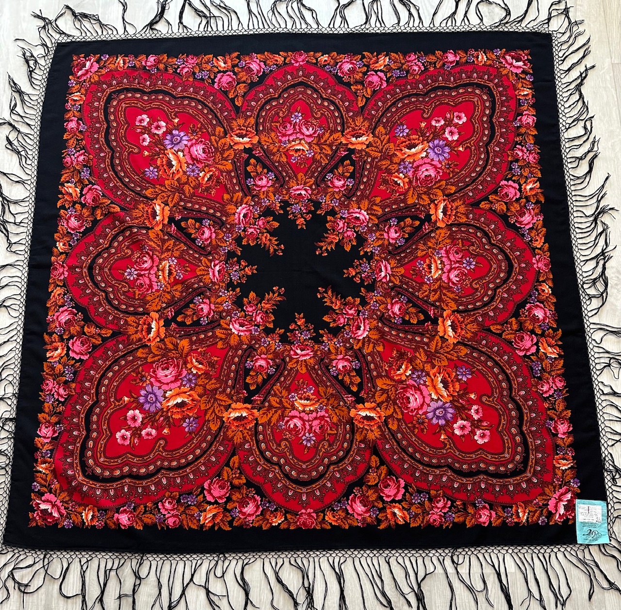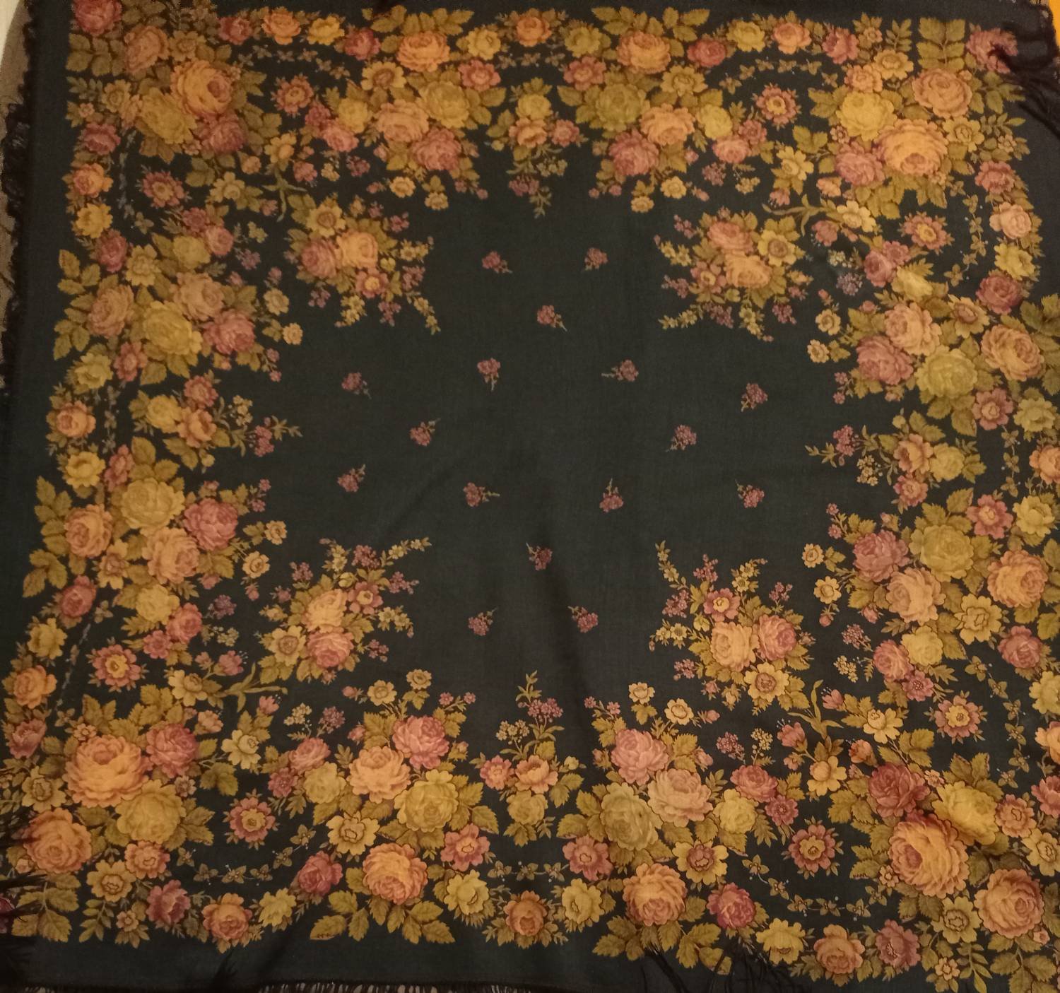 Появился в моей коллекции жаккардовый платок, в идеальнейшем состоянии, размер 108×108, с одной стороны одинарная подгибка, с другой без подгиба. Кто-нибудь может поделиться ссылкой на историю таких платков, каким годом датирован, может изестно?