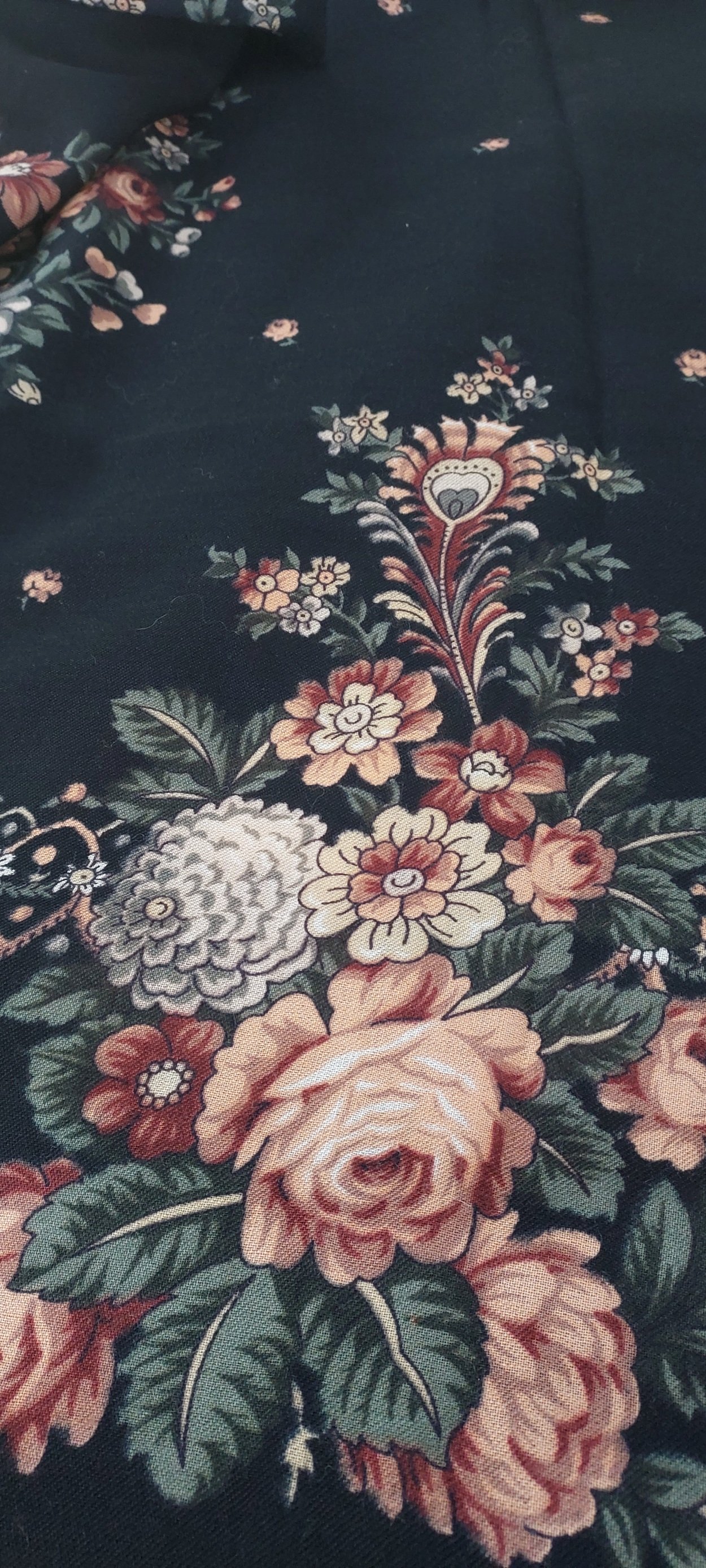 Моё впечатление от платка, который я сразу отнесла к категории мрачнушек, итак, платок очень необычный, видно, что его не носили, видно, что рисунок старинный, пёрышко прелесть, на дневном свету платок, конечно, выглядит намного ярче, он вполне носибельный, будет хорош на светлом.