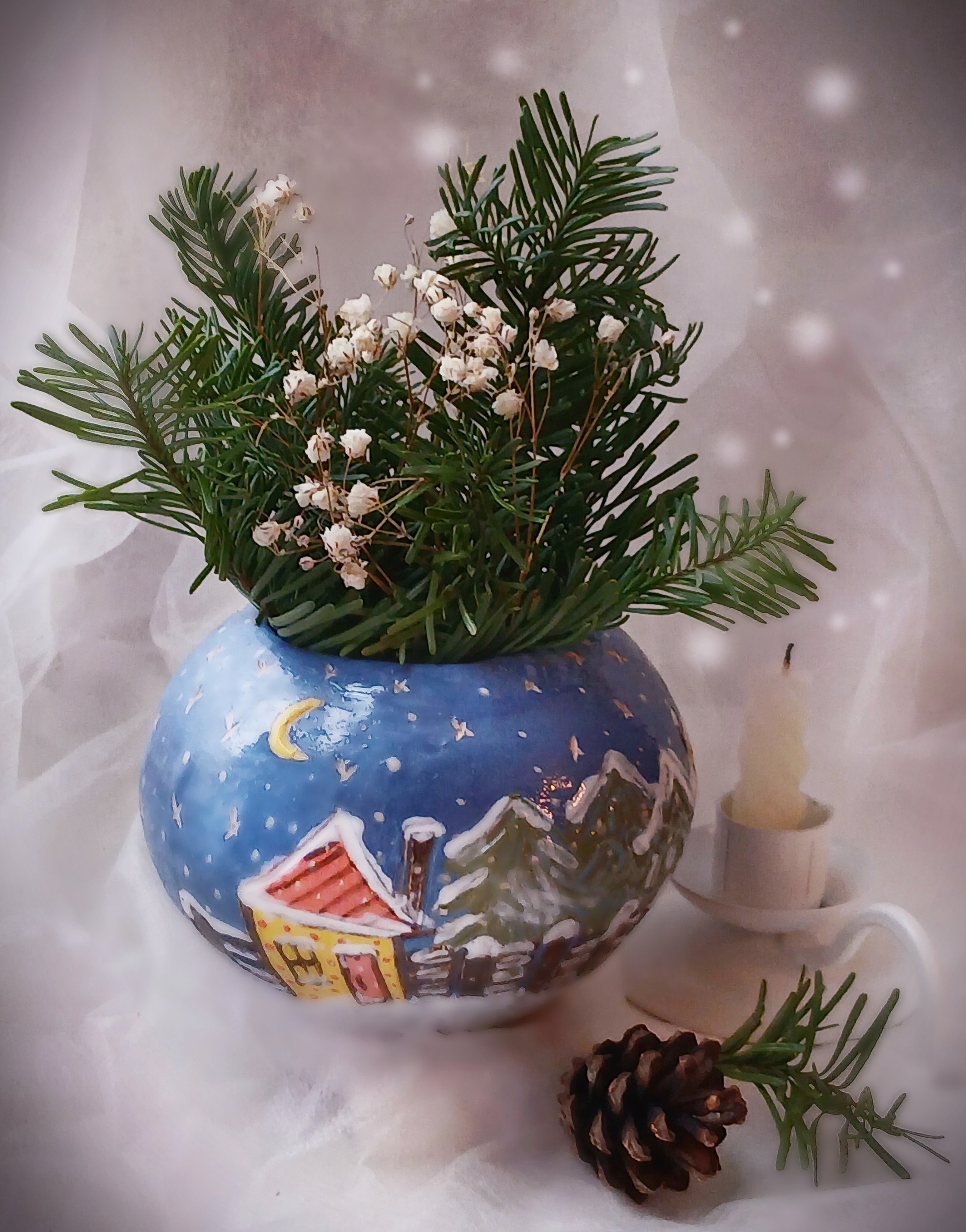 ...всю зимнюю ночь медленно и мечтательно кружился снег... неугомонный ветер сморило сном... лишь разлапистые еловые ветки под белоснежной тяжестью.......))