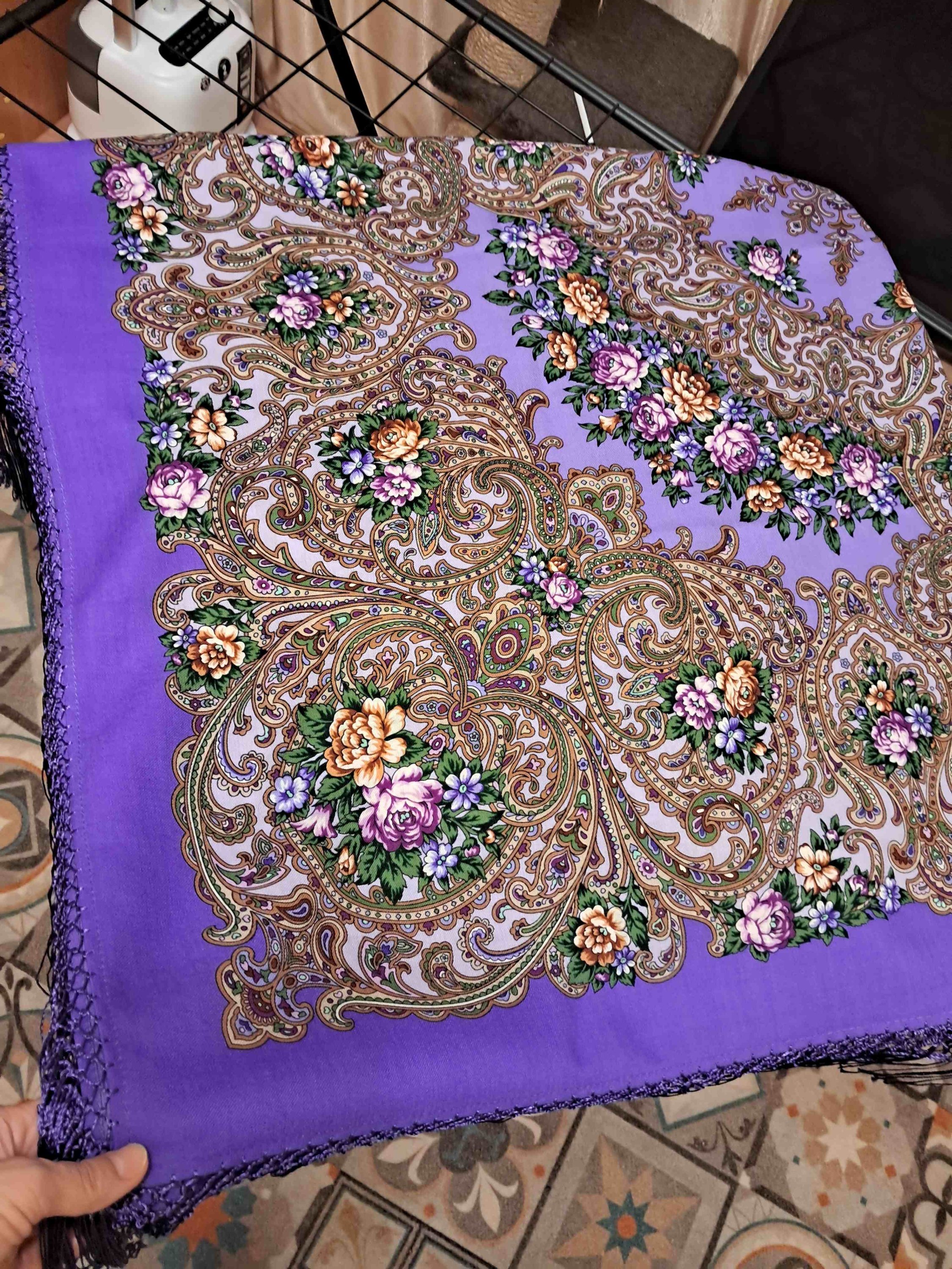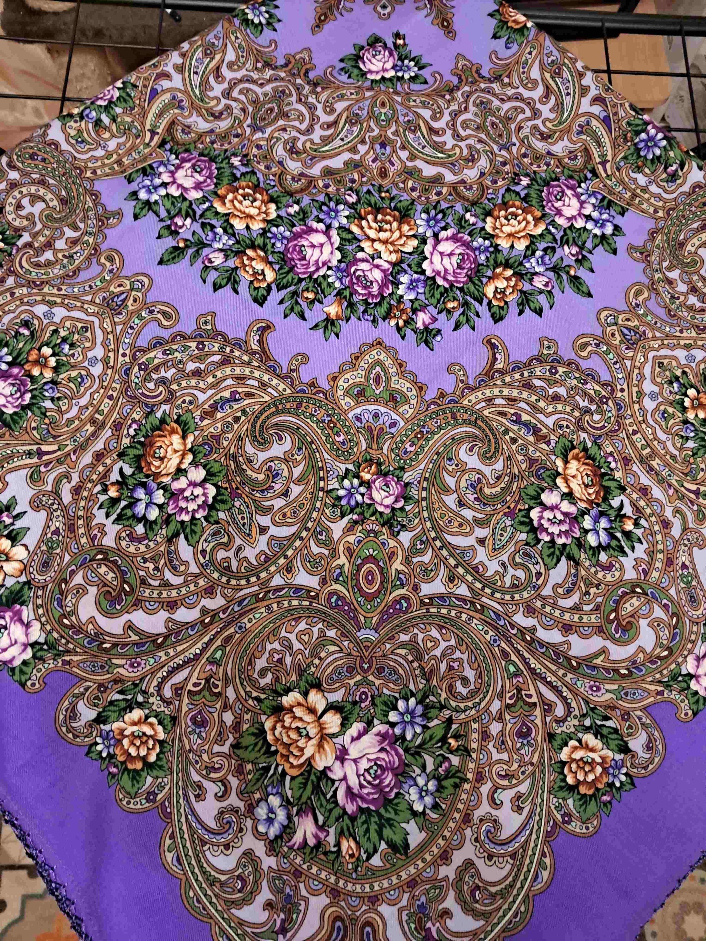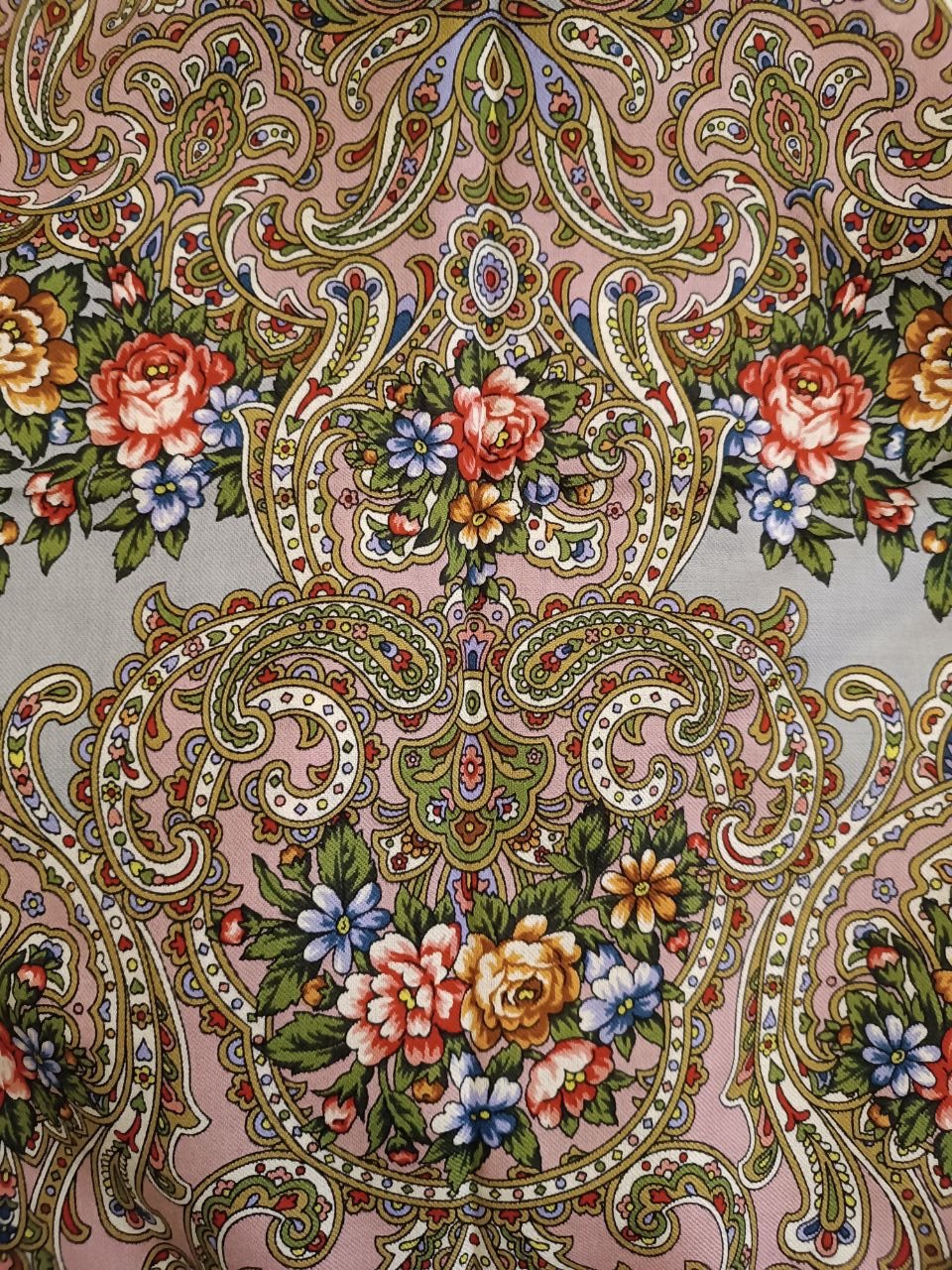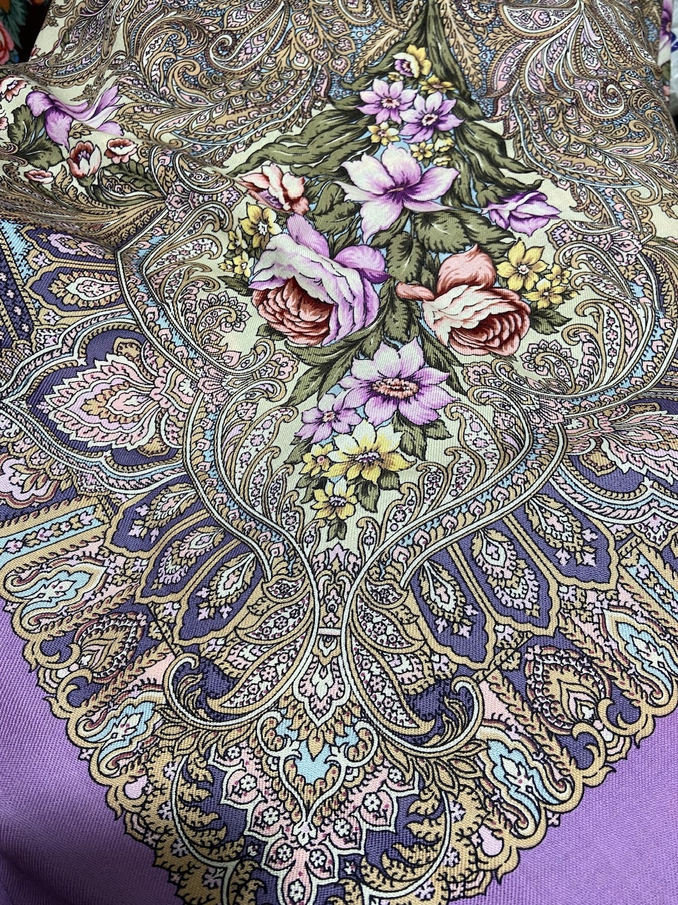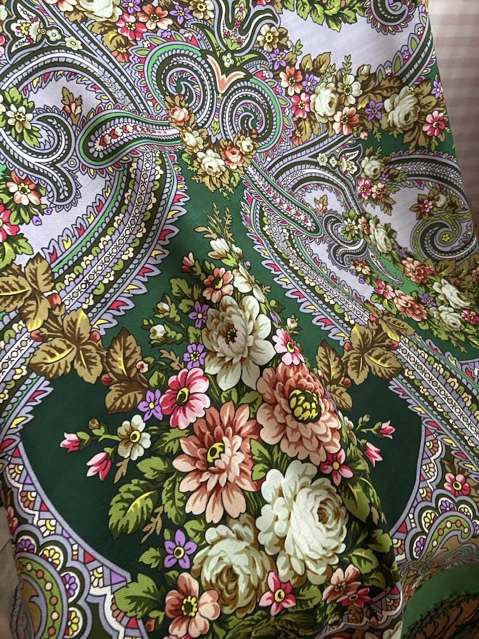 Платок красив: рисунок и колористика. Печать 2020 года. Мне не нравятся ткани на изделия конца 2020 и 2021 годов. Электризуются сильно нет этой шелковистости....так и тут бахрома бесперестанно липнет к платку.
