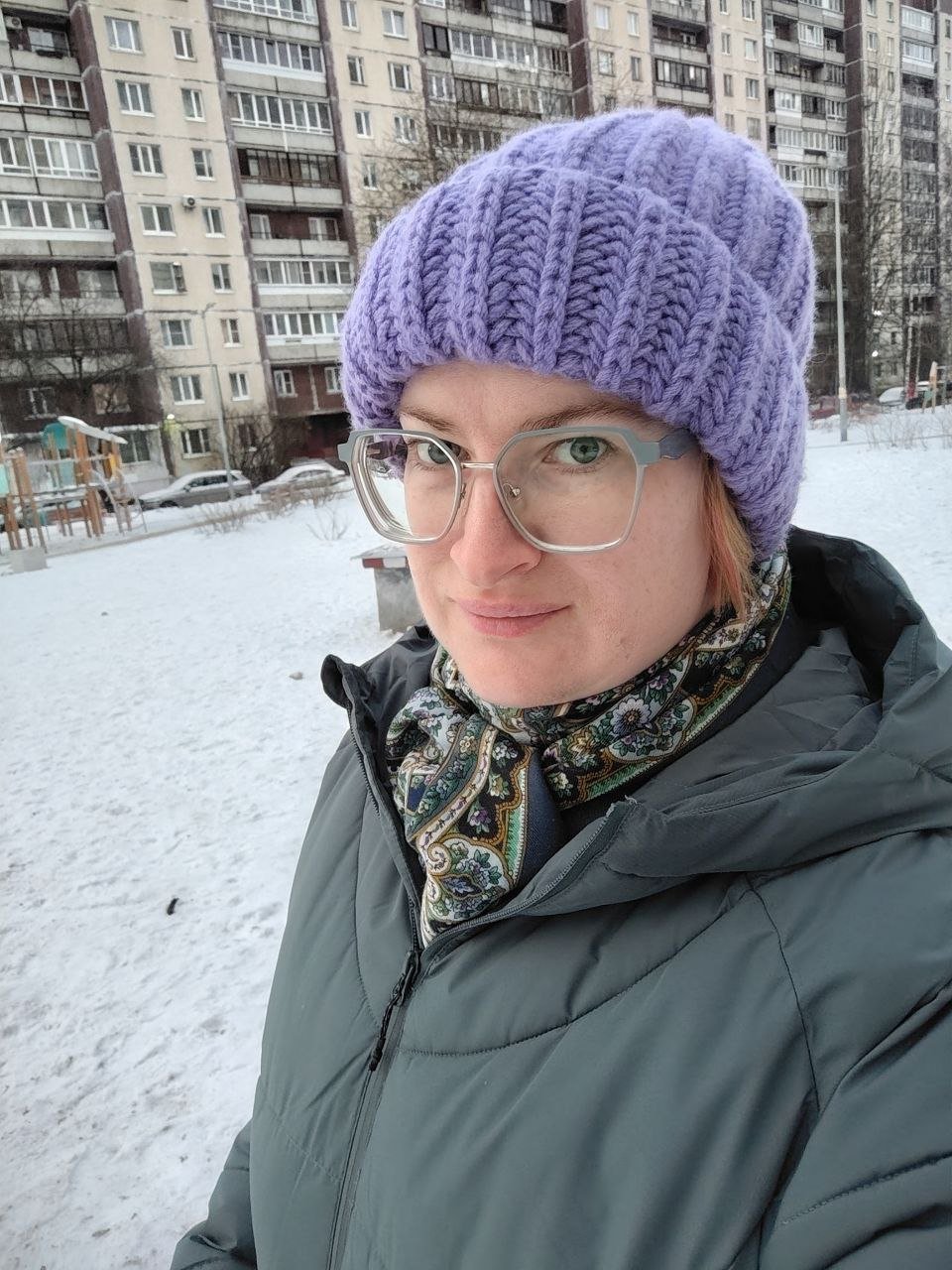 Вот сегодня надела "Чёрные глаза" 18. Под самое обычное дутое пальто. Рисунка мало видно, но у нас мороз -14 С, поэтому всё ушло на утепление.