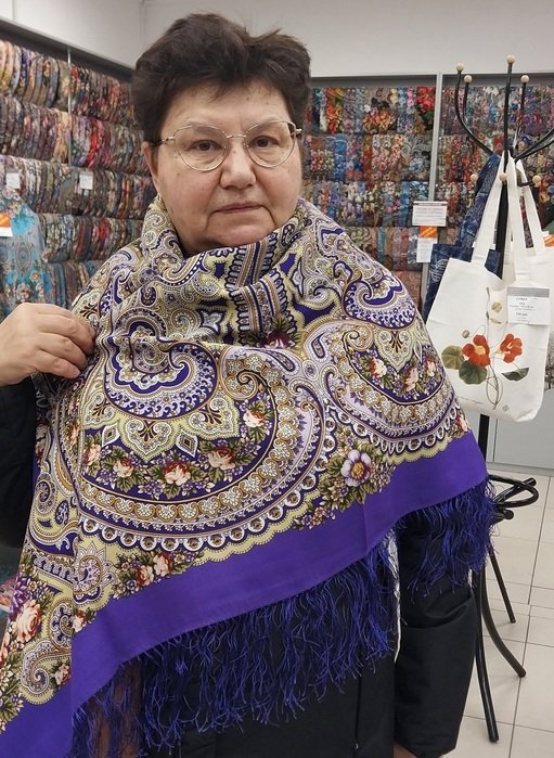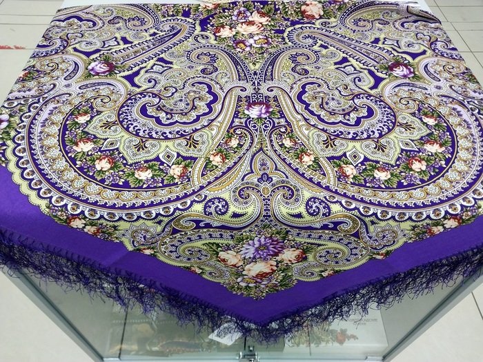 Золотая карусель — одна из самых недооценённых шелковых шалей, а ведь какая изысканная, и рисунком, и цветом. У меня фиолет, куплен случайно, а носится чаще других.