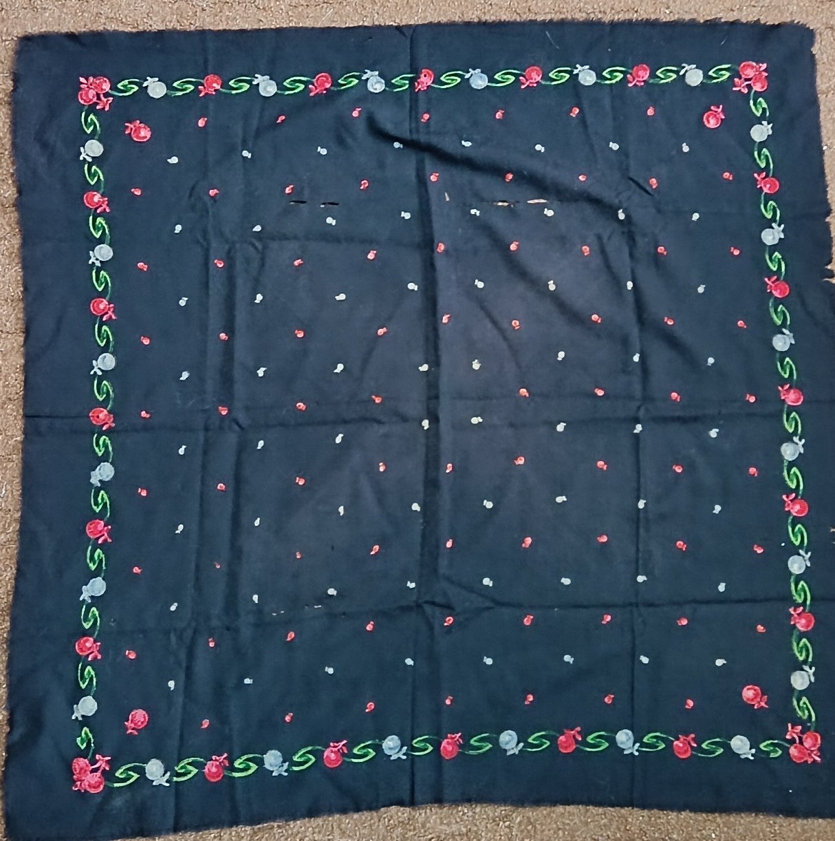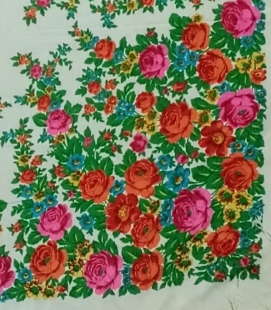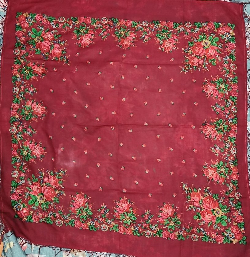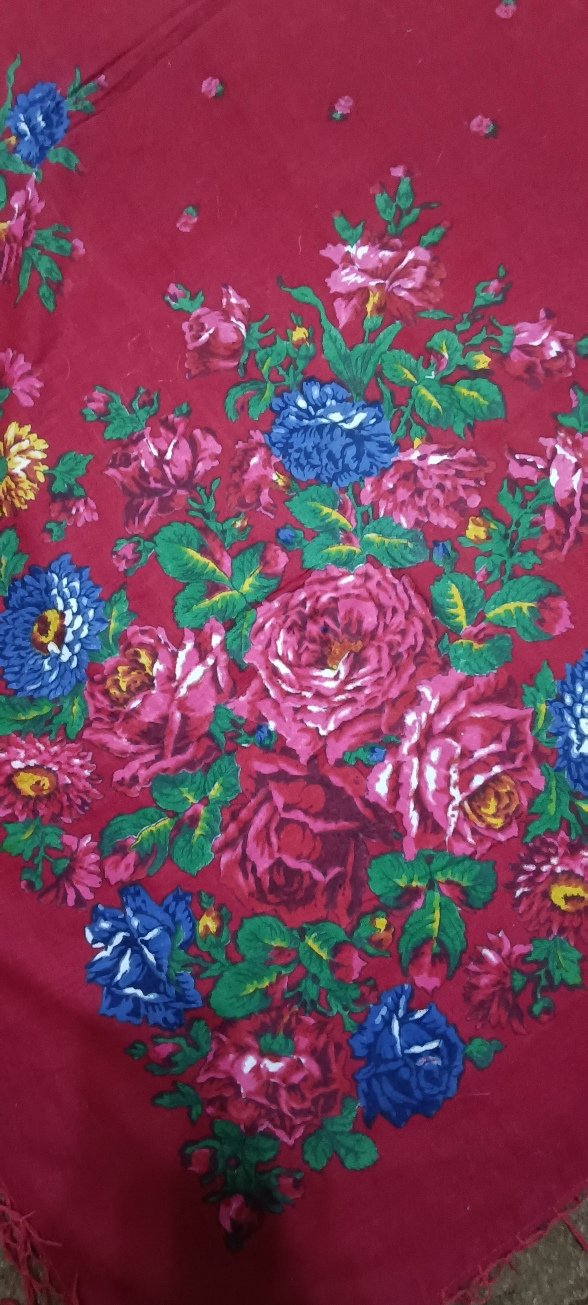 Старинный платок на просновках, размер 100×100 ,,никаких опознавательных знаков с изнанки нет, бахрома шерстяная, две стороны с одним подгибом, другие две без подгиба