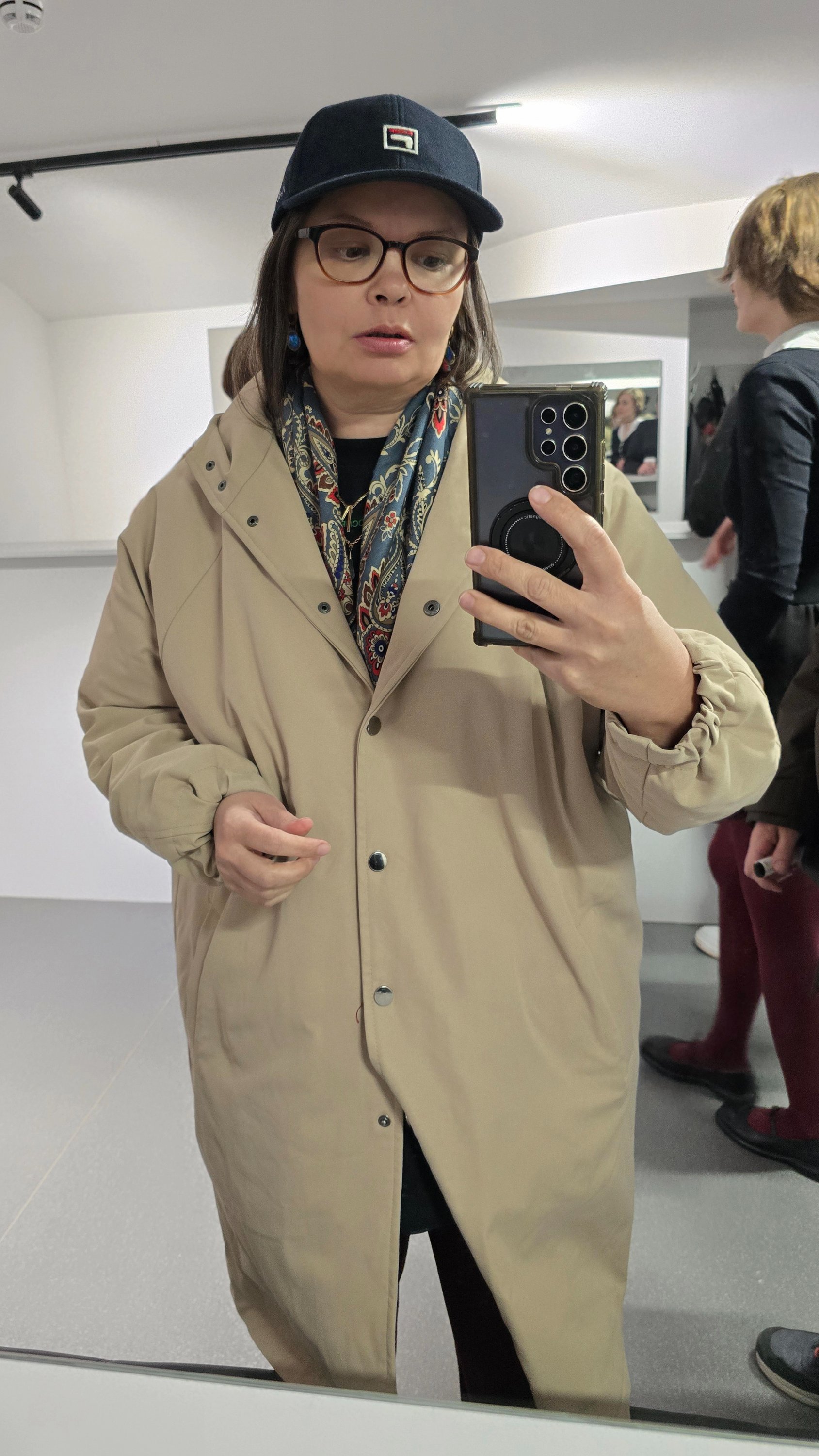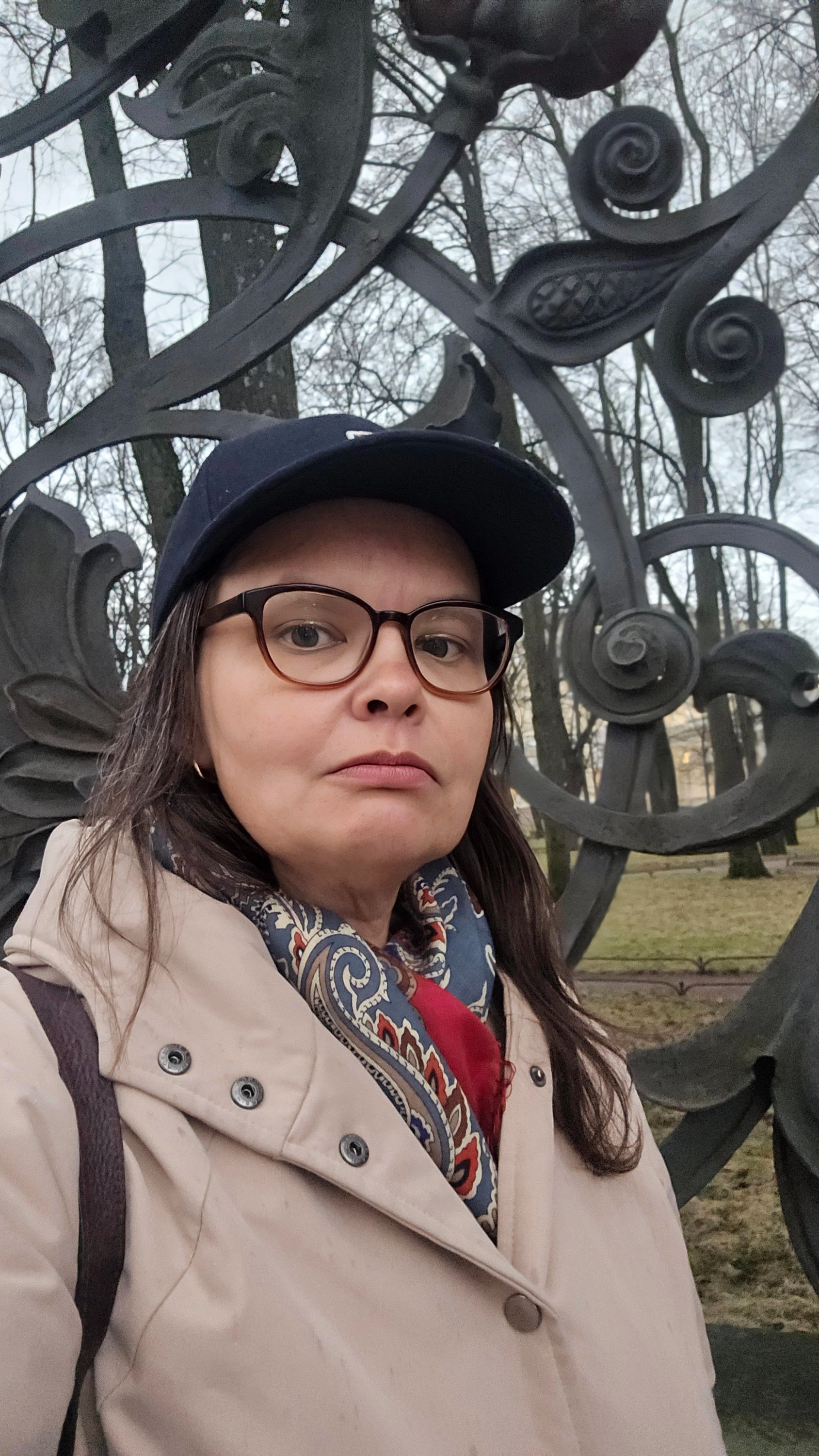 Платок для моего глаза серо-красный , поэтому я старалась чтобы его не видно было под бежевым пальто Но внезапно поняла что надо растягивать верхнюю пуговицу и выпускать платочек наружу, так хорошо он дополняет светлую верхнюю одежду! А ещё он классно будет смотрится на тёмно-синем)