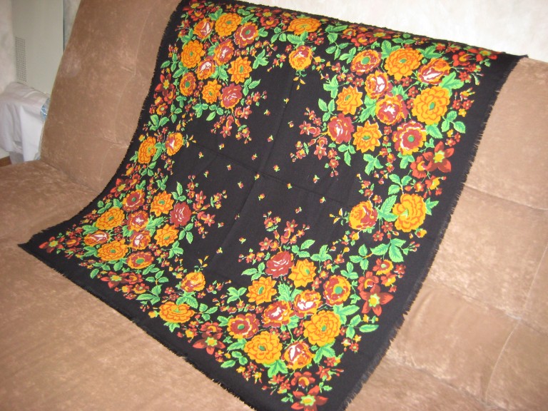 Куплен продавцом в советские времена. Размер – 85 х 85 см. Без кистей. Состав – предположительно 100% шерсть.