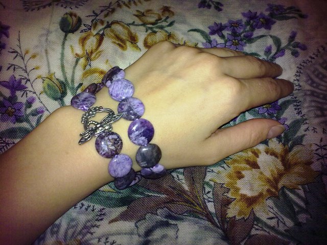 А ещё некоторое время назад я купила много чароитовых бусин -- чтобы сделать из них длинные бусы, или короткие + много серег и браслет, или что-то ещё.