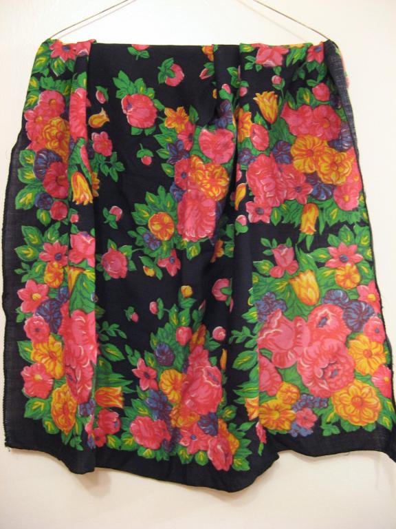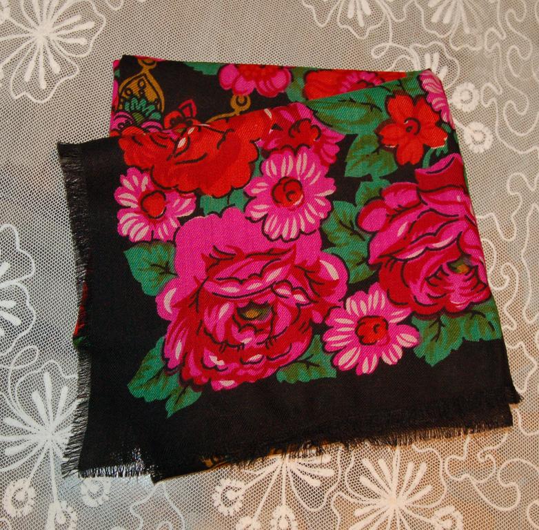Iра81, очень интересный и красивый платок! Какого он размера? Очень понравилось (особенно это заметно на первой фотографии), что при всей традиционности расцветки платок хоть и выдержан в павловопосадском колорите (черный фон-розовые-красные цветы-зеленые листья), но нет крикливости, ядрености, схематичности в цветах. Очень светится роза на первой фотографии, почему-то при взгляде на Ваш платок в памяти всплывают жостовские подносы.