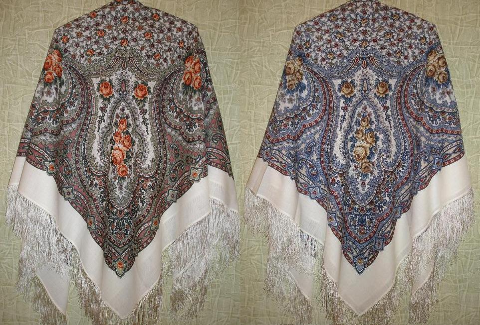 ), как будто между ними есть разница - это засчет золотисто-красноватой бахромы у ЦВ и зеленоватой у Рябинушки. Если подвернуть шали так, чтобы не было видно рисунка и каймы, то различия исчезают.