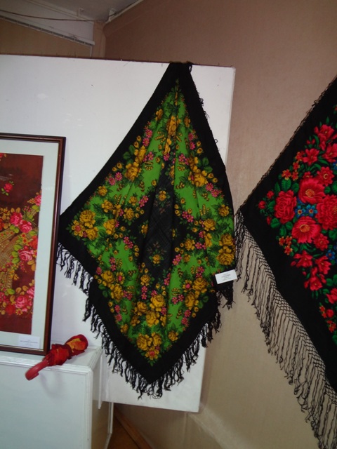 Как и обещала ранее, размещаю в этой теме свои фотографии с выставки. Заранее предупреждаю и приношу извинения за то, что цвета шалей, платков и, возможно, картин, искажены. Условия съемки не позволяли сделать фотографии более качественными, хотя об искаженной цветопередаче я узнала только дома при просмотре фоторгафий. Очень расстроилась этим фактом.