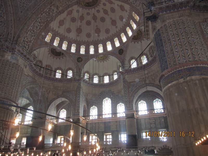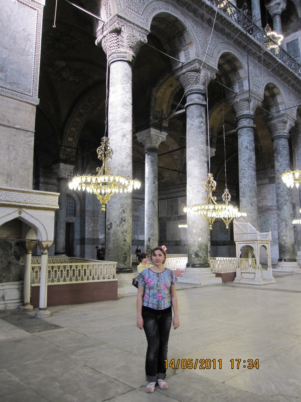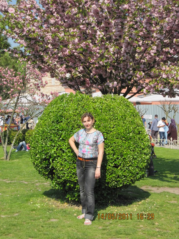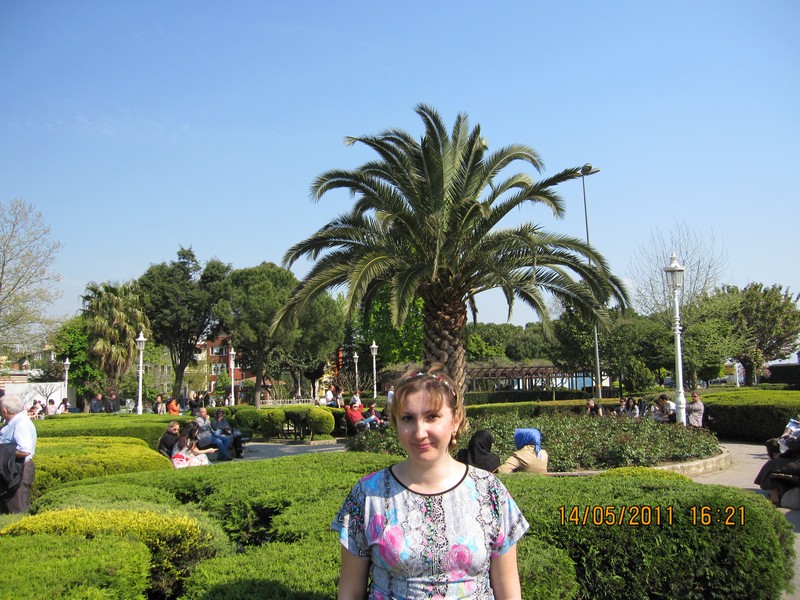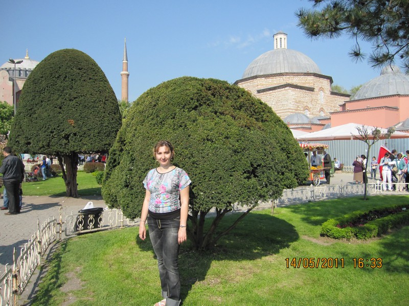 На фоне Голубой мечети. Мечеть построена в начале 17 в. Единственная мечеть в Стамбуле, имеющая 6 минаретов. Мечеть Султан Ахмед приобрела второе название - Голубая мечеть - из-за своей красоты и цветовой палитры фаянса.