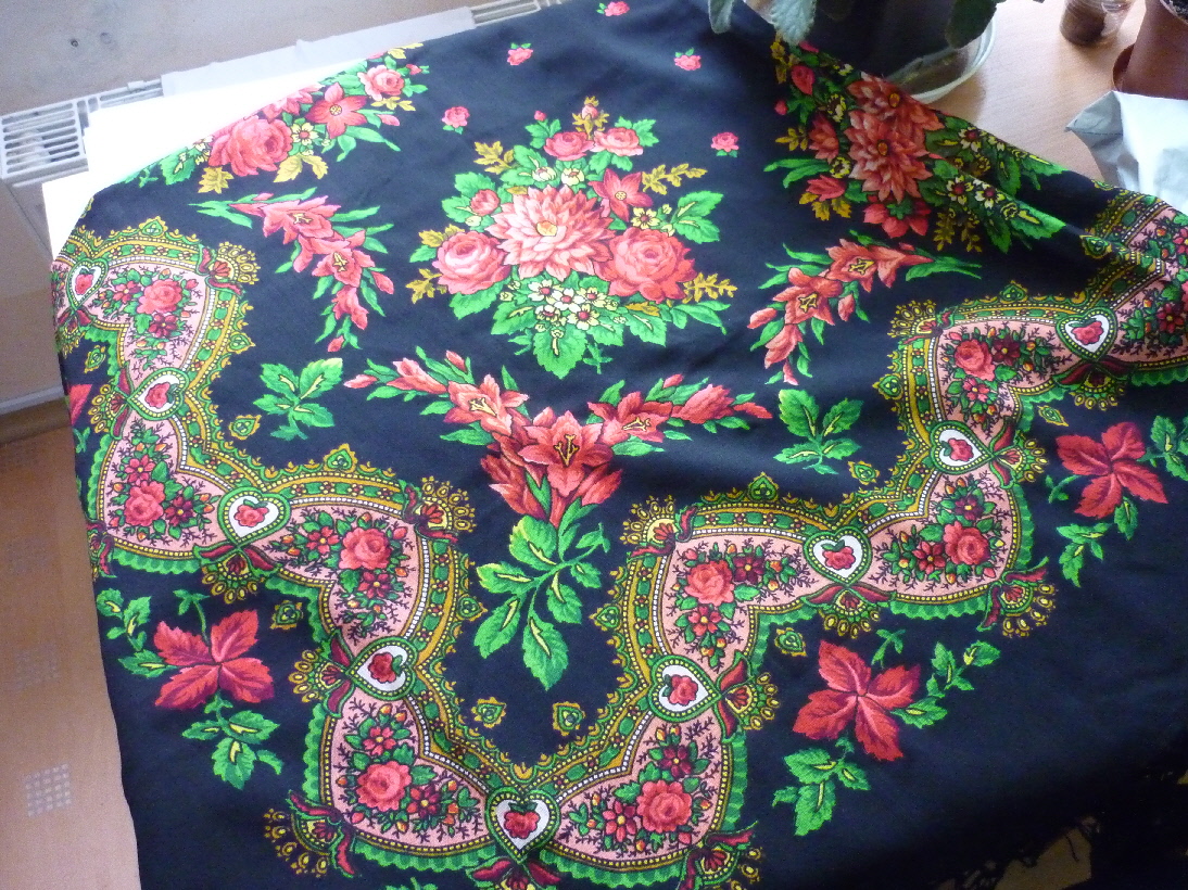 Купленный когда-то фиолетовый ВЕЧЕРНИЙ подарила, а вот с таким колоритом не рассталась бы ни за что. Только назвала бы платок по-другому - не Вечерний, а ДЕРЕВЕНСКИЙ :) .