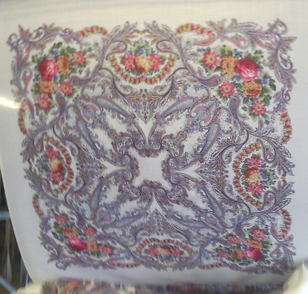 Будет называться "Цветочная сказка". Раньше выпускался без названия. Фото с видеокамеры, качество плохое, но Мила говорит, что очень красивый. Классические павловопосадские розы во всей красе. 146х146.