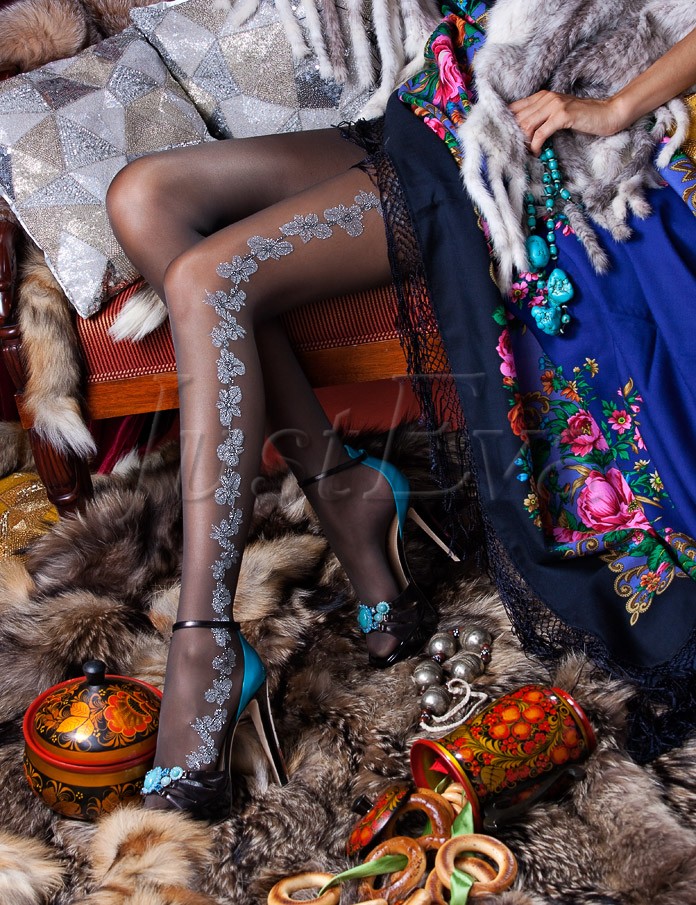 Вышила пока только одну ногу и забросила... Колготки чёрные плотные. Вышивать нужно, натянув на пластиковую бутылку. У меня вышивка шёлковыми (натуральными) узкими лентами, бисером, очень крошечными пайетками и шёлковыми нитками перле. Сейчас так сильно захотелось закончить и вторую ногу...