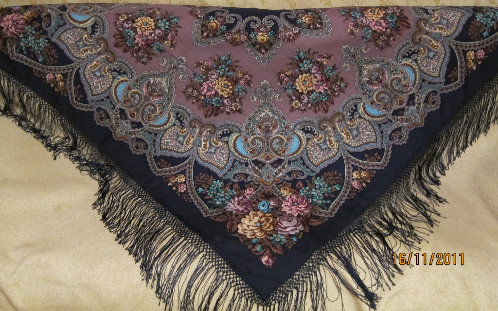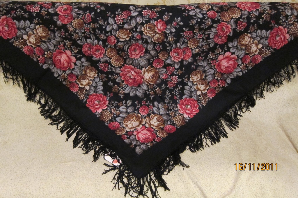 Мне очень нравится рисунок Русского сувенира, я все бью себя по рукам, чтоб не прикупить с темно-зеленым краем из ограниченной серии - но вот с чернопольным бы наверняка не удержалась. Роскошная шаль.
