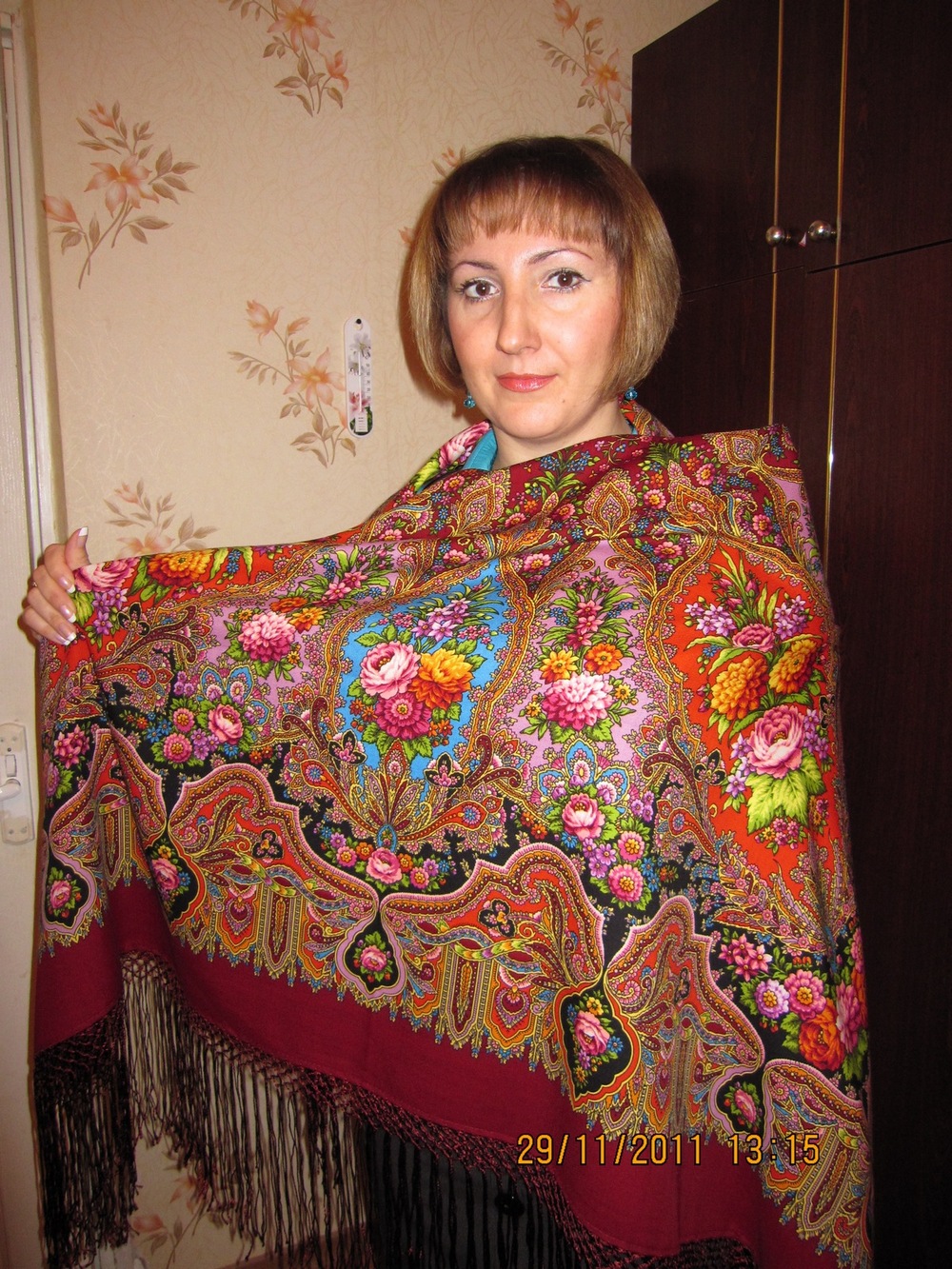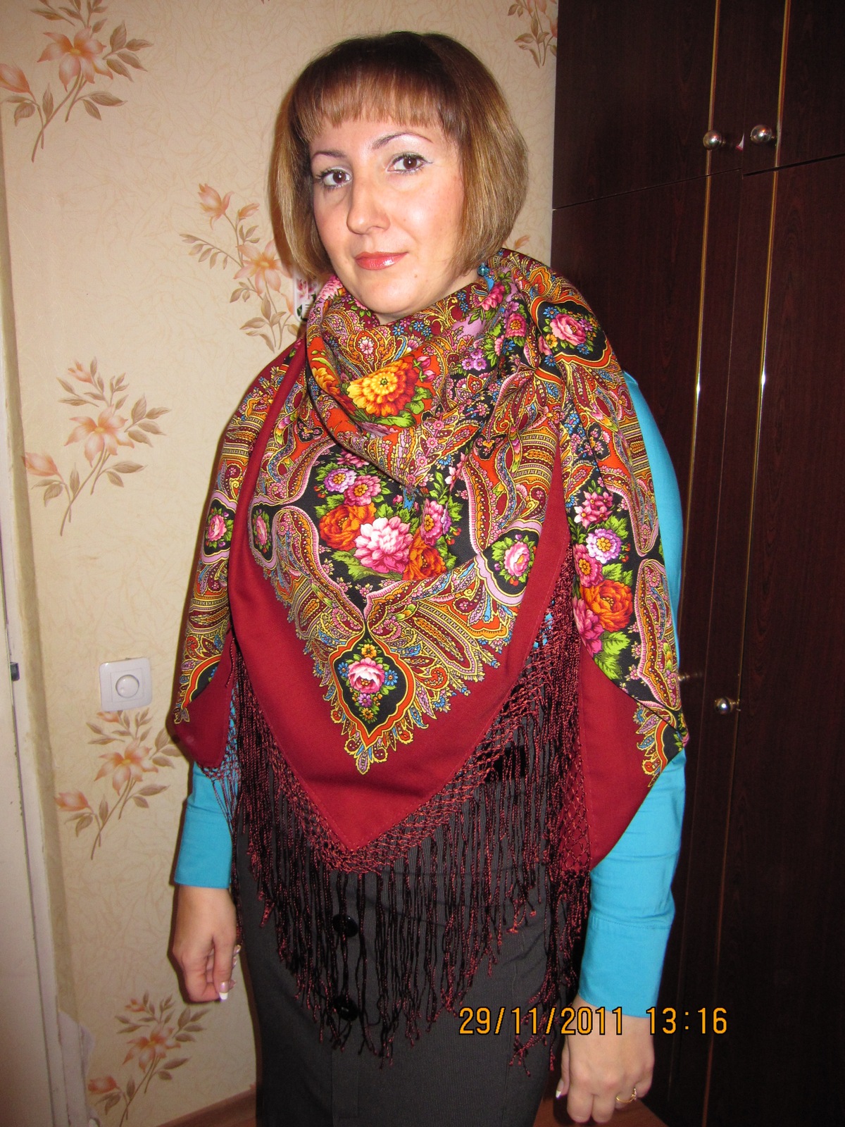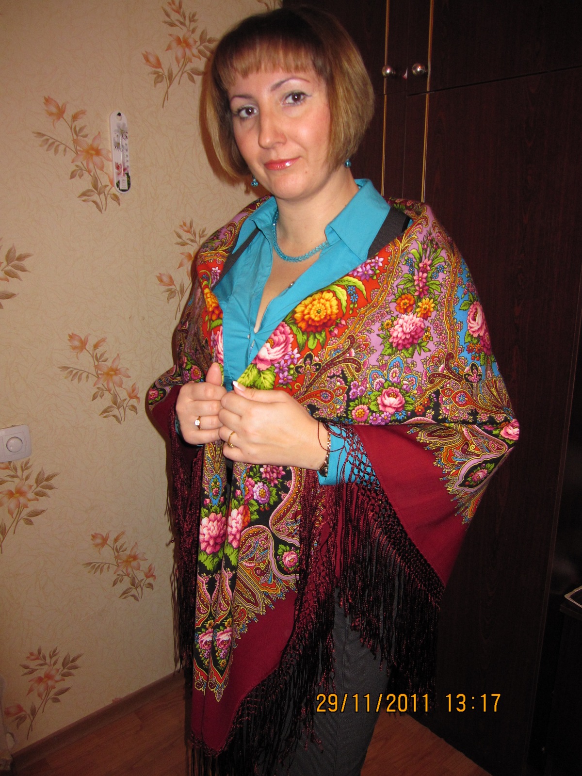 . Неожиданно для меня понравилась шаль с бирюзовой рубашкой-все ярко, нарядно. Понравилось на улице с бордовой кацавейкой