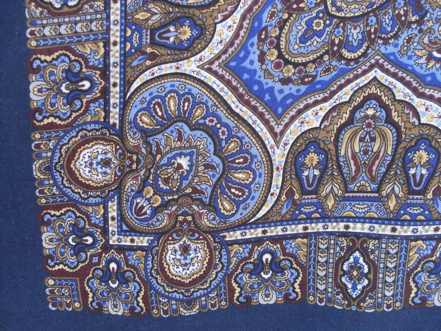 А этот платок я очень долго не понимала. Честно говоря на фотографиях, а тем более на сайте интернет-магазина невозможно рассмотреть красоту его рисунка. Мелкий, прорисованный, словно чудесное кружево. Просто мне захотелось отдохнуть от крупных цветов, долго выбирала между Испанским, Садко и Ларцом самоцветным. Выбрала последний. Понравилось сочетание цветов: сине-голубое с коричнево-желтым, лаконичное и сдержанное, в современной версии синего Испанского оттолкнули розово-сиреневые оттенки. Наверное у меня вернулся синий период.