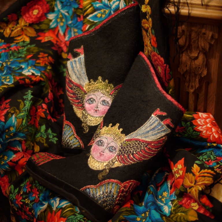 Заболела валенками не хуже чем платками! Покажу сегодня одну пару, которую выбирала дочурка. Ей приглянулись длиннючие черные самовалки. По колено. Валенки толстые, плотные, прекрасно подошли под роспись. Нашелся отличный мастер - подшил подошву просто художественно. Слегка обрезала верх и расписала - получилась такая вот парочка: по птичке счастья на каждую девичью ножку. Очень подружились с чернопольными платками.