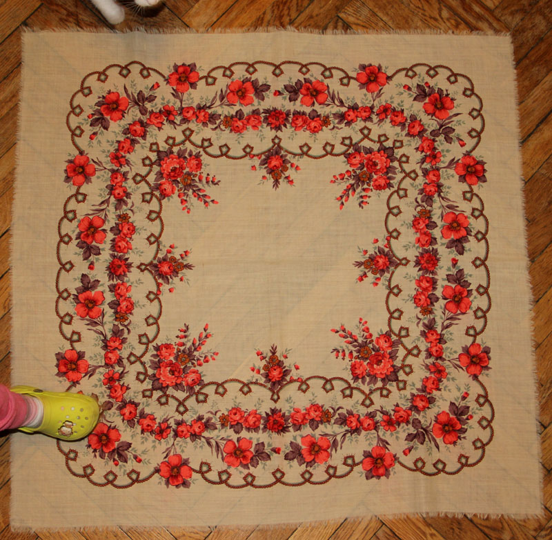 Скорее этот всего платок так и останется без имени. В старых каталогах я такого рисунка не нашла. Платок 89x89 см., с осыпкой. На фото цвет ушёл в розоватость (из-за электрического освещения). Попробую детали сфотографировать у окна.