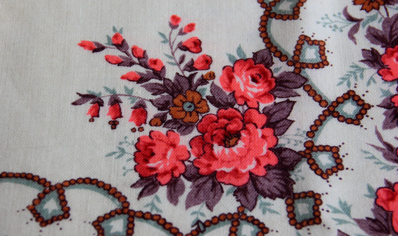 Скорее этот всего платок так и останется без имени. В старых каталогах я такого рисунка не нашла. Платок 89x89 см., с осыпкой. На фото цвет ушёл в розоватость (из-за электрического освещения). Попробую детали сфотографировать у окна.