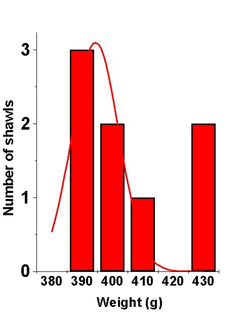 Короче говоря, все случайные отклонения в весе должны лежать на этой непрерывной кривой нормального распределения. Что и выполняется для всех шалей, кроме 2-х с весом от 425 г до 435 г.