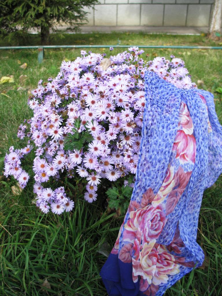 ! Про астры - да, конечно, осенние ассоциации возникают, только если знаешь, в какое время года они цветут. Я во время съемки (надо было уложиться в обеденный перерыв) вошла в азарт, уже просто искала красивые сочетания природы и платков.