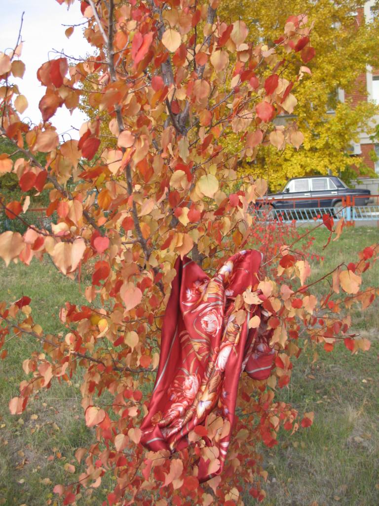 Пыталась найти перекличку между рисунком на платочке Утренний свет и листьями дерева (не знаю его названия). И только на фото увидела, что цвет розы почти такой же. И почему-то в голове завертелась песня. "В мокром саду осень забыла рваный платок мокрой листвы..." Почему - не знаю, и платок не рваный, и мокрого ничего нет.