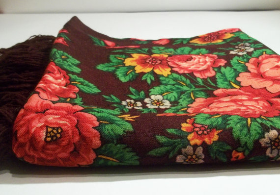 Scarf - cashmere Russia 1980 flowers very beautiful combination basic color like an eggshell with lots of colorful flowers -excellent condition dimensions of 57.5 inches 59 inches fringe six inches