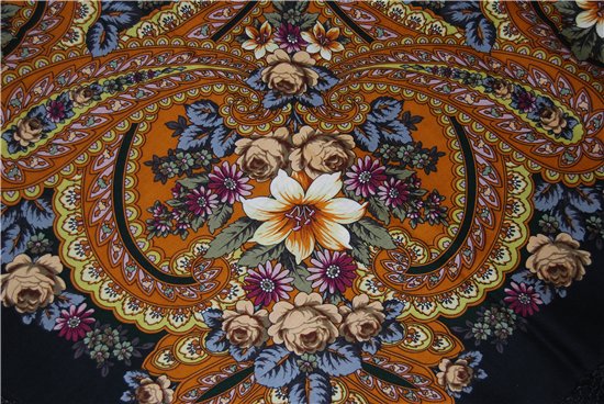 А вот мой улов, Весенние грезы 23, у меня так бывает, смотрю и не трогает, а потом, вдруг, щелк, и будто глаза по-другому смотрят, не знаю, почему эти грезы весенние, для меня это очаровательная золотая осень, какой цветок чудесный в центре, цветовое решение всего платка