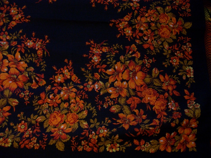На самом деле это шаль (в данном случае 149х149см). Ткань тонкая. Шерстяная клетка. На изнанке вшита белая х\б этикетка (маленький кусочек ткани) с №4 (может это артикул и можно по нему опознать шаль или автора - спрошу у platki). Кстати на Рапсодии Клары Зиновьевой такая же этикетка с номером 83 (или 89-немного выцвело). Шаль в некоторой степени монохромная - оттенки оранжевого от огненно-морковного до апельсиново-рыжего и рыжевато-коричневого, болотного. Трудно передать цвета. Шаль очень яркая, огненная. Изощрялась и со вспышкой и без вспышки.
