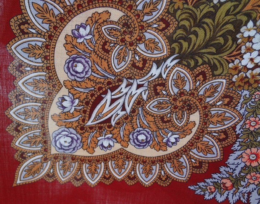 Хороший, спокойный темно-красный цвет, одинаковый на кайме, середине и в центре платка. Общее ощущение от платка-теплое. "Освежают" серебристо-серые орнаментальные узоры и синие цветочки. Листики оливковые, в медальонах-персиковый, цветы коралловые и коричневатые. Снимала без вспышки, на балконе, но красный кажется ярче, чем есть на самом деле.