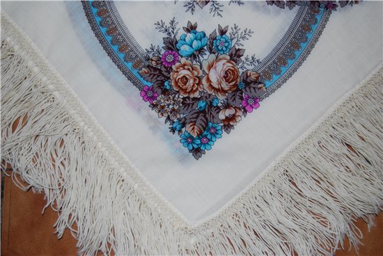 Покажу свой Весенний ручеек-4, ткань мне нравится, тонкий, мягкий, но не такой тонюсенький, как Аромат лета, этот совсем как марлевка, что же касается рисунка, он совершенно очарователен. Аромат лета 4 меня тоже влюбил в себя нежностью красок, много пространства без рисунка, тонюсенький, ужас какой, но в качестве летней шали он меня устраивает, хотя, думаю, жизнь такого платка коротка, кроме того, я совершила подвиг, оторвала бахрому, и сама навязала из тонкой шерсти клетки в два ряда, во!
