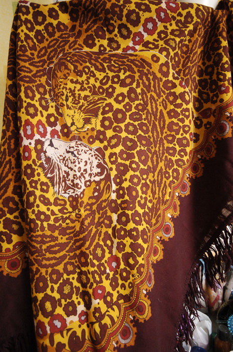 кайма коричнево-бордово-сливовая, бахрома шерстяная без клеток, по леопардовому полю пущены красно-коричневые стрелы пятен и найдена полузакрашенная пятном печать 1991 года