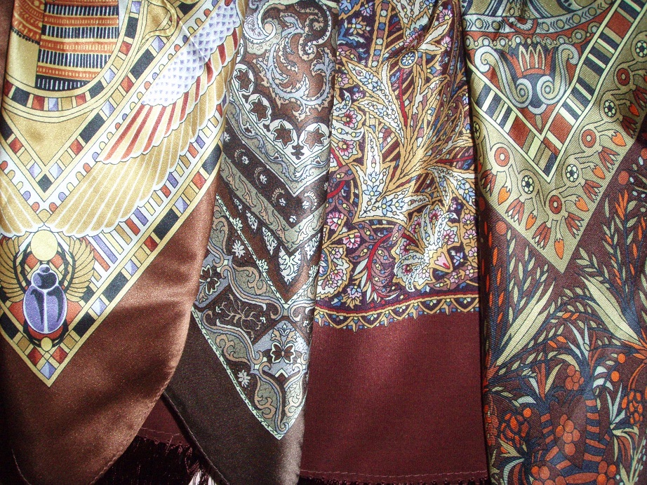 Они "приблизительно похожи", но разные, конечно. В "Золоте Исиды" близкий тон каймы, но преобладание зеленовато-жёлтого золота. А в "Жасмине" - жёлтый цвет чуть темнее цвета яичного желтка. Ну, и по размеру рисунка - у "Жасмина" очень тонкий и мелкий рисунок, и "Золота Исиды" - крупный. Заодно - фото с "Новеллой" и со "Скарабеем". Кайма "Скарабея" - тон молочного шоколада, у "Новеллы"-горького шоколада, у "Жасмина" и "Золота Исиды" - ближе к бордово-коричневому. Фотографии сделаны при разном освещении (шёлк капризничает...)