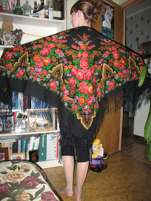 У меня есть "Русская красавица" с изумрудными розами. Постараюсь сфотографировать поскорее. Платок не новый, был отдан мне подругой, знающей, что я платки и шали люблю и активно ношу. Ко мне платок попал с уже слипшейся и несимпатично выглядящей шерстяной бахромой. Вот как раз подумываю, не реанимировать ли бахрому...
