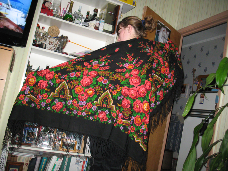 У меня есть "Русская красавица" с изумрудными розами. Постараюсь сфотографировать поскорее. Платок не новый, был отдан мне подругой, знающей, что я платки и шали люблю и активно ношу. Ко мне платок попал с уже слипшейся и несимпатично выглядящей шерстяной бахромой. Вот как раз подумываю, не реанимировать ли бахрому...