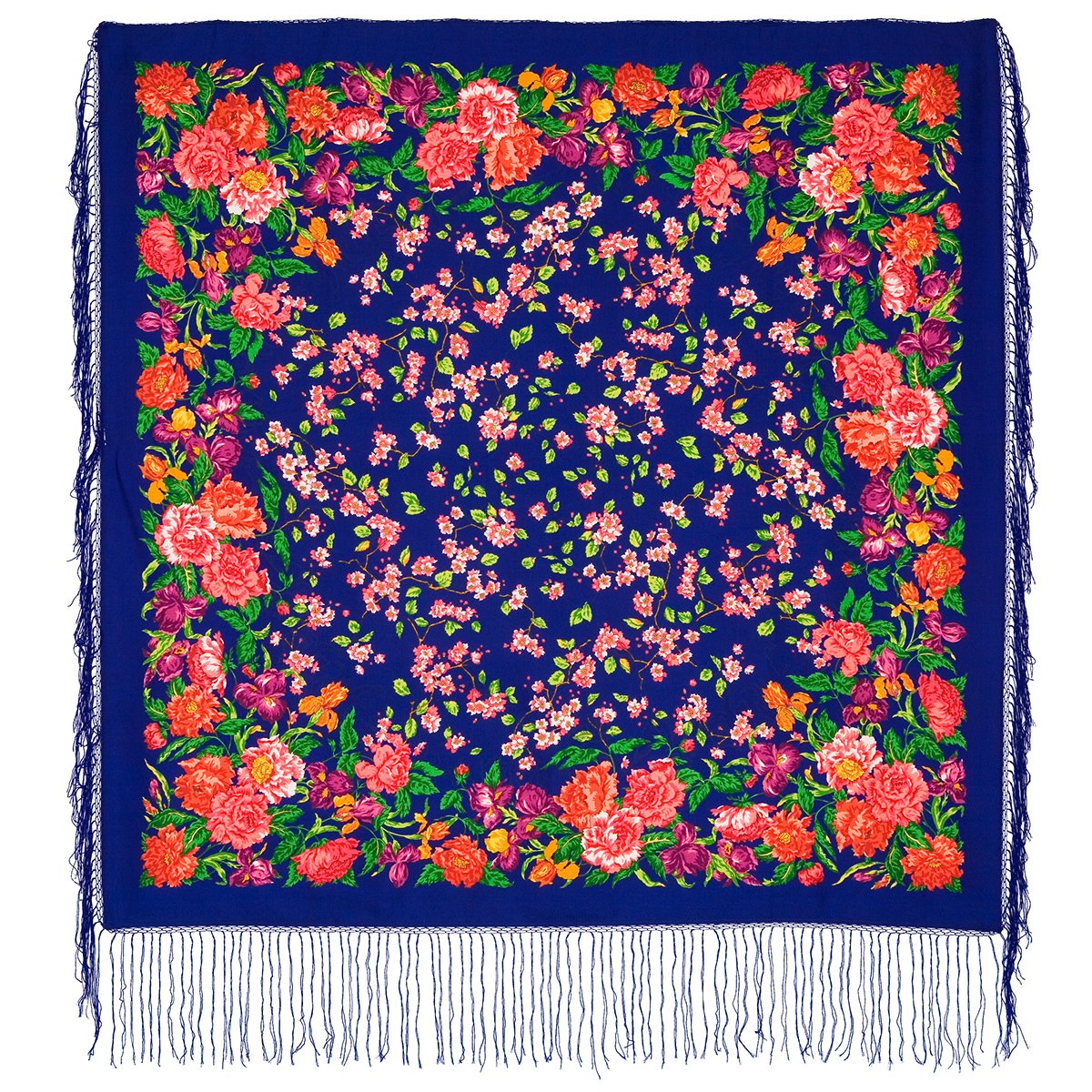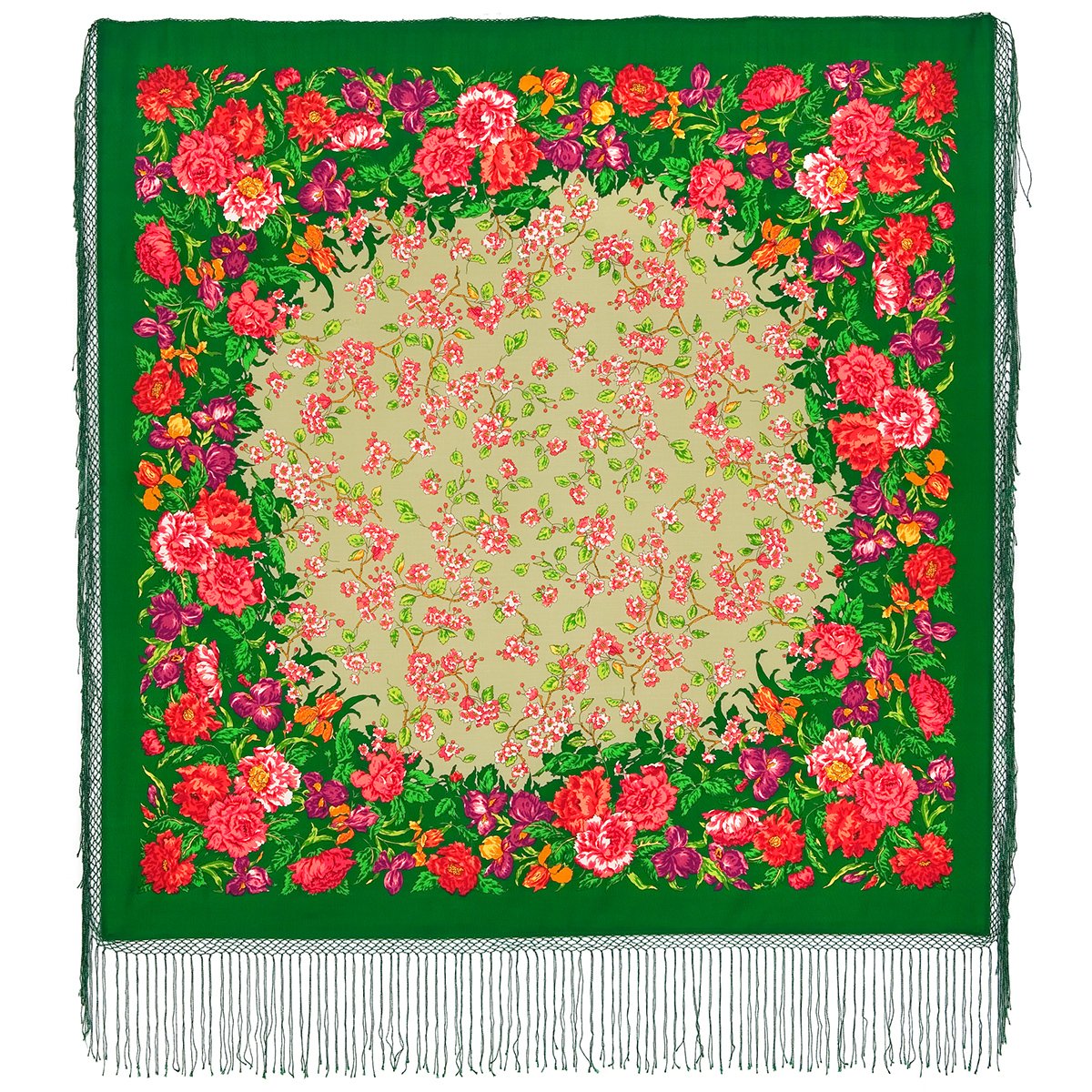 Шаль из уплотненной шерстяной ткани с шелковой бахромой "Цветущий сад", рис. 1210, 148х148см