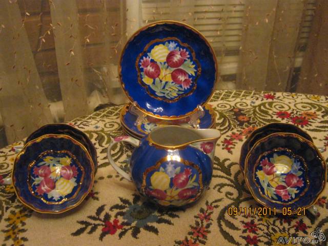 Посмотрела - красивый, особенно красный. Понравилось, что чашки внутри тоже расписные. Нашла фото сервиза 70-х годов и новое. У старого чашечки внутри не только расписные, но и цветные.